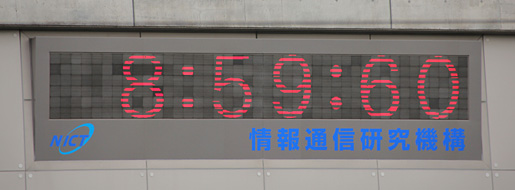貴重な「うるう秒」挿入の瞬間を体感する方法があるので、ご紹介しておきましょう。ひとつは日本の標準時を管理するNICTの本館(東京都小金井市)に行くことです。ここのデジタル時計は「8時59分59秒」の後に「8時59分60秒」を表示します。同じく武蔵小金井駅の構内にあるNICTのデジタル時計も「8時59分60秒」を表示します。一方、おなじみのNTT117時報サービスですが、通常の加入電話の場合は、午前9時の4秒前から予報音を3回(58秒59秒60秒)鳴らし、時報音(ポーン)を1回(00秒)鳴らします。 ちょっと面白いのは、ひかり電話の117時報サービス。こちらは9時を告げる時報音(ポーン)を連続して2回(60秒00秒)鳴らすそうです。うるう秒挿入時にしか聞けない珍しい"ダブルの時報音"を聞くことができるのですね。