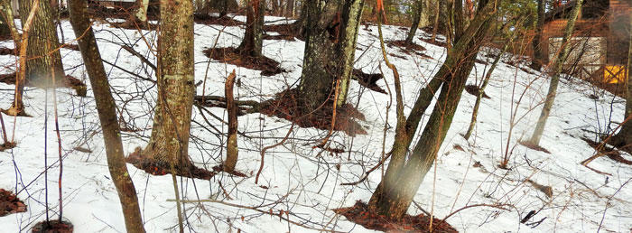 而另一方面,内在原因是树木体内的水分移动。春天接近时,日照会逐渐增强,树木即会通过地下深层的树根吸收水分。这是为了帮助越冬后的树枝嫩芽茁壮成长。这种温暖地下水的移动可以使树木体内温度上升,从而使树木周围的积雪开始融化。