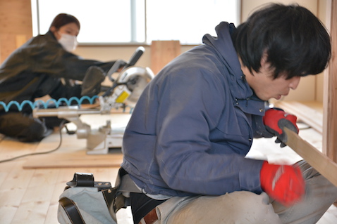 フローリング張りで最も時間のかかる作業は、やはりフロア釘のポンチ打ちです。この工程にエアー工具を使用することで、手作業でフロア釘を1本打つ間に10本以上の釘を打ち込むことができます。