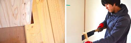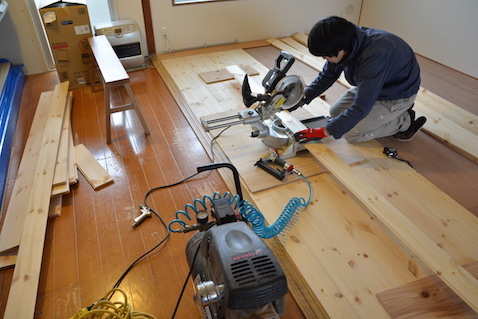 フローリングの閉じ方にはいくつか方法があるのですが、トーリーは幅を測って押し入れるカタチにしました。ここでもあて木をして金槌でたたきつつ、さらにトーリー(嫁)に体重をかけてもらっています。