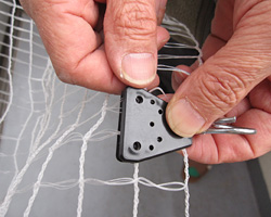 ネットをぴんと張るために、こんな押さえ金物を使いました。野菜のビニールハウス用に売っています。ネットに余裕がある場合にはお試しください。