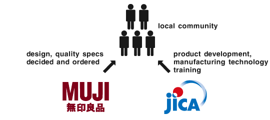- A good (favorable) relationship through the creation of things This time, the local people provided the labor power while MUJI supplied technological assistance towards sales. Through this kind of creation, producers not only gain compensation but also know-how as an industry, while MUJI gains good quality products; a relationship where both sides gain an advantage can be built.