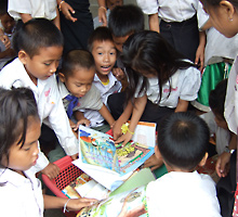 ラオスにて、新しい絵本が届いて喜ぶ