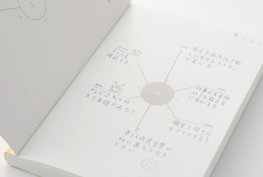 ほとんどのスケジュール帳は罫線、方眼などで区切られており、柔軟性に欠けたり見づらい点があります。このノートではスケジュールを計画的に進めるために、1日を時計で表しました。これによりひと目で予定と時間が把握できるようになります。