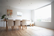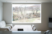 大きなピクチャーウインドーで切り取られた、信州の美しい山並みと表情豊かな雑木林。太陽は刻々と変化して、差し込む陽光は室内の白い壁に光と影を描き出します。「イタリアの教会の光の動きが好きなんですよ」と語るKさん。「トスカーナの一つ星レストランで、小さな窓の向こうに、丘の上の小屋が切り取られて見えたのが印象的でした。それが私の『窓の家』の原風景かも知れません」。お仕事はイタリアンレストランのオーナーシェフです。お父様は建築家で、建築への造詣も深いKさんの「窓の家」を訪ねました。