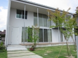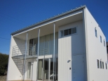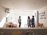4間半×3間、3階建ての「窓の家」です。1階には土間床の作業部屋をつくり、家族の集まるリビングは2階につくりました。奥行1間のインナーバルコニーは広々、かつ夏の日差しが室内に入りにくいようにしています。外壁は「ホワイト」の窯業系サイディングです。