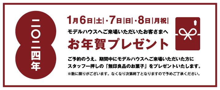 1月6日(土)〜8日(月祝)の3日間はご予約の上モデルハウスへご来場いただいた方へ、心ばかりのお年賀としてスタッフ一押しの「無印良品のお菓子」をご用意しています。