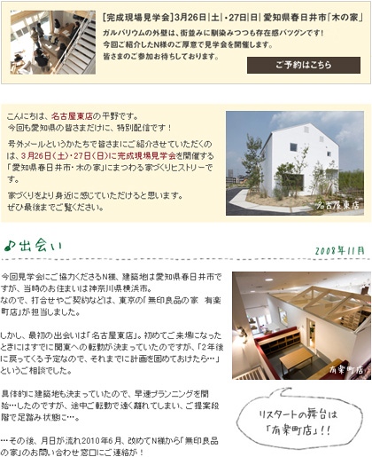 今度の家つくり見学会では、無印良品の家を建て、そこへ住んでいる方々やこれから住む方々の自宅を訪問します。 完成した無印良品の家をじっくり見学できるのはもちろん、実際に家をつくり、暮らしている方ならではの、体験に基づいた素直な本音が聞ける機会です。お気軽にご参加ください。