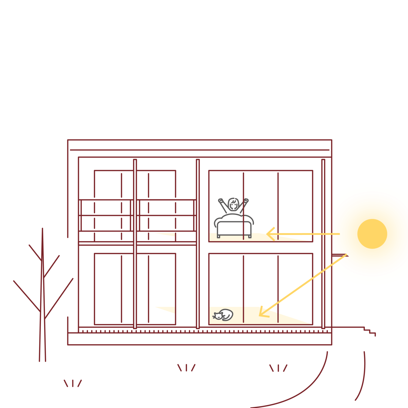 日の出を迎えると太陽の光を取り込みはじめ、家の中の温度が上昇します。太陽の位置にあわせて窓の大きさや位置を設計しているため、効率的に太陽の光を取り入れられます。