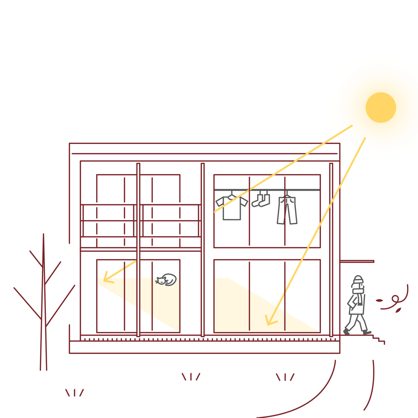 「日射シミュレーション」を行い季節や時間ごとの太陽の位置を計算し、それに合わせて窓の位置や大きさを設計します。そのため、夏の暑い日差しを遮り、冬は日差しを効果的に取り込みます。