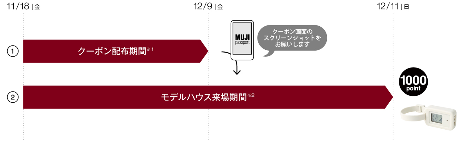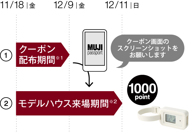 12月11日までの期間中、ご予約のうえモデルハウスへ来場いただいたお客様にMUJIショッピングポイント1,000ptを差し上げます。さらに、クーポン画面のご提示で温湿度計を差し上げます。