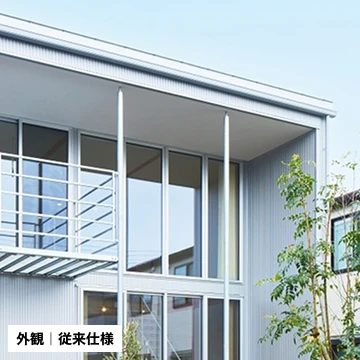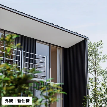 「木の家」は通常鉄柱で軒を支える構造となっていますが、軒先を薄く仕上げることで鉄柱をなくし、すっきりとした外観仕様のバリエーションを追加しました。