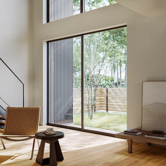 幅の広い開口部も二枚建てとしてサッシ枠の線を減らすことで、外からの光や景色をできる限りありのままに室内へ取り込みます。
