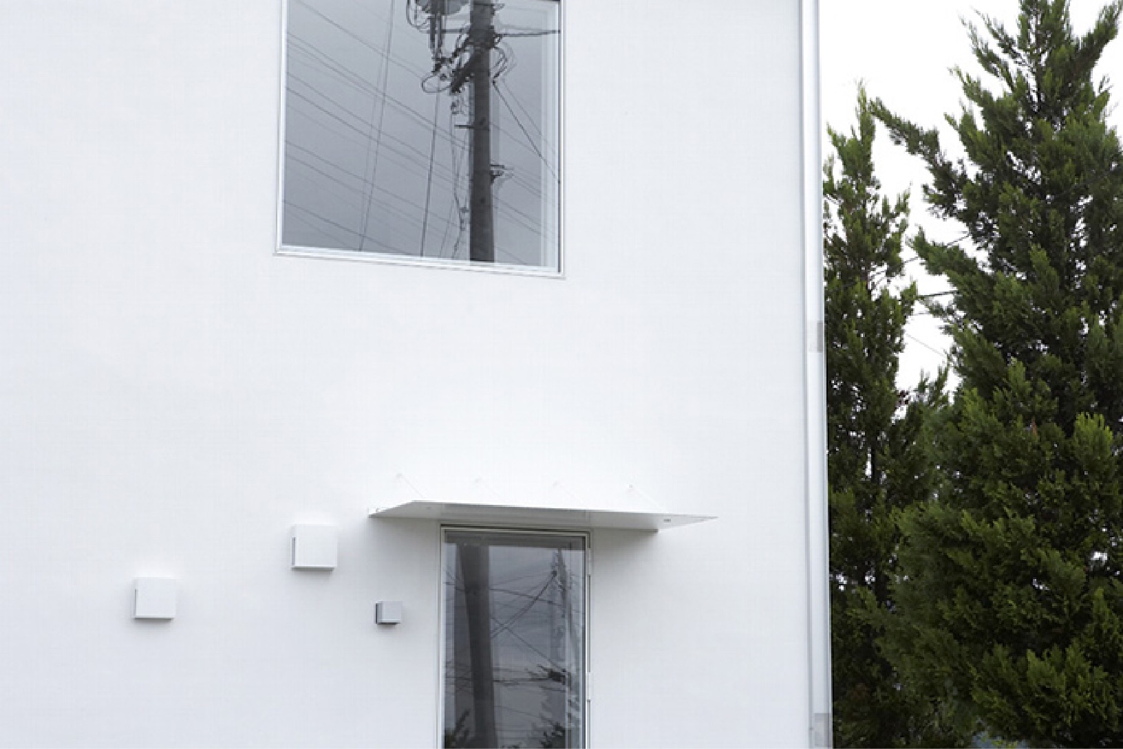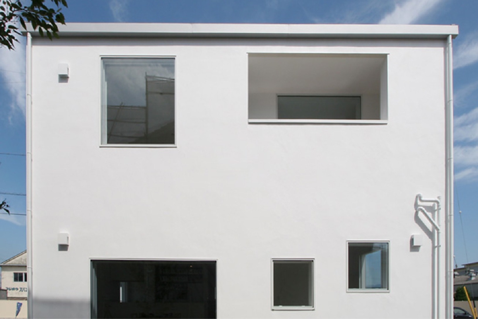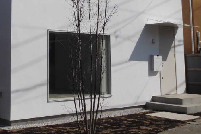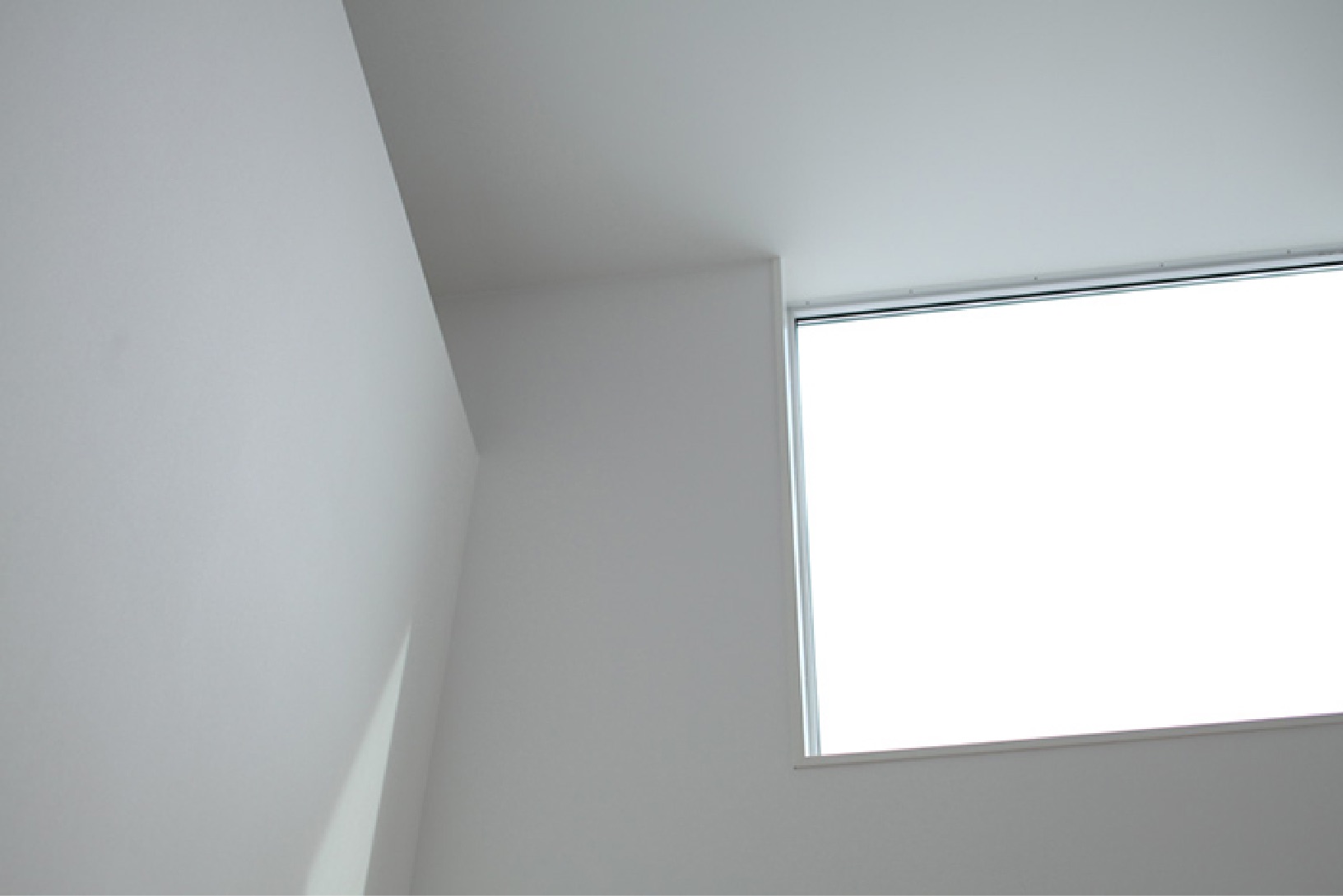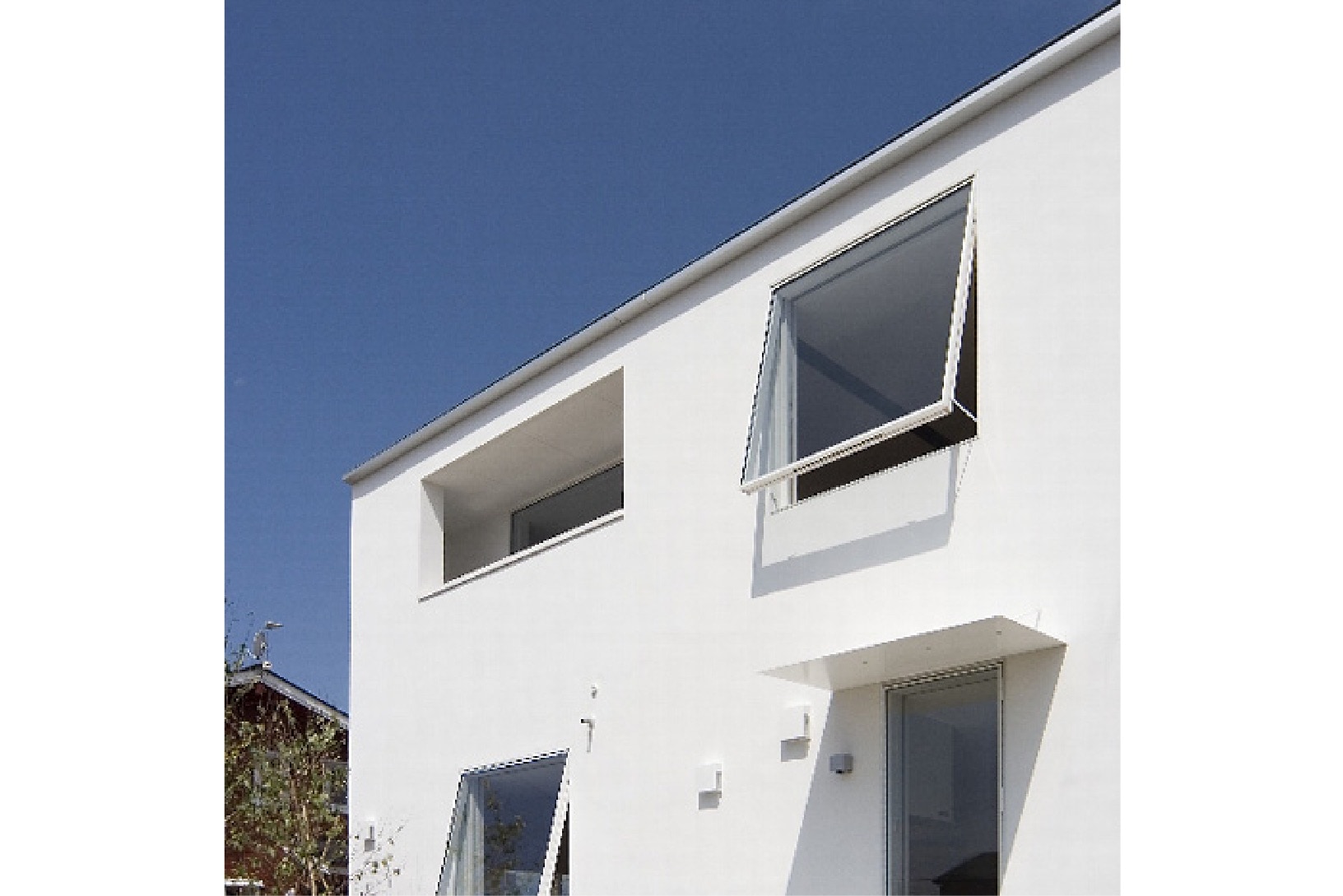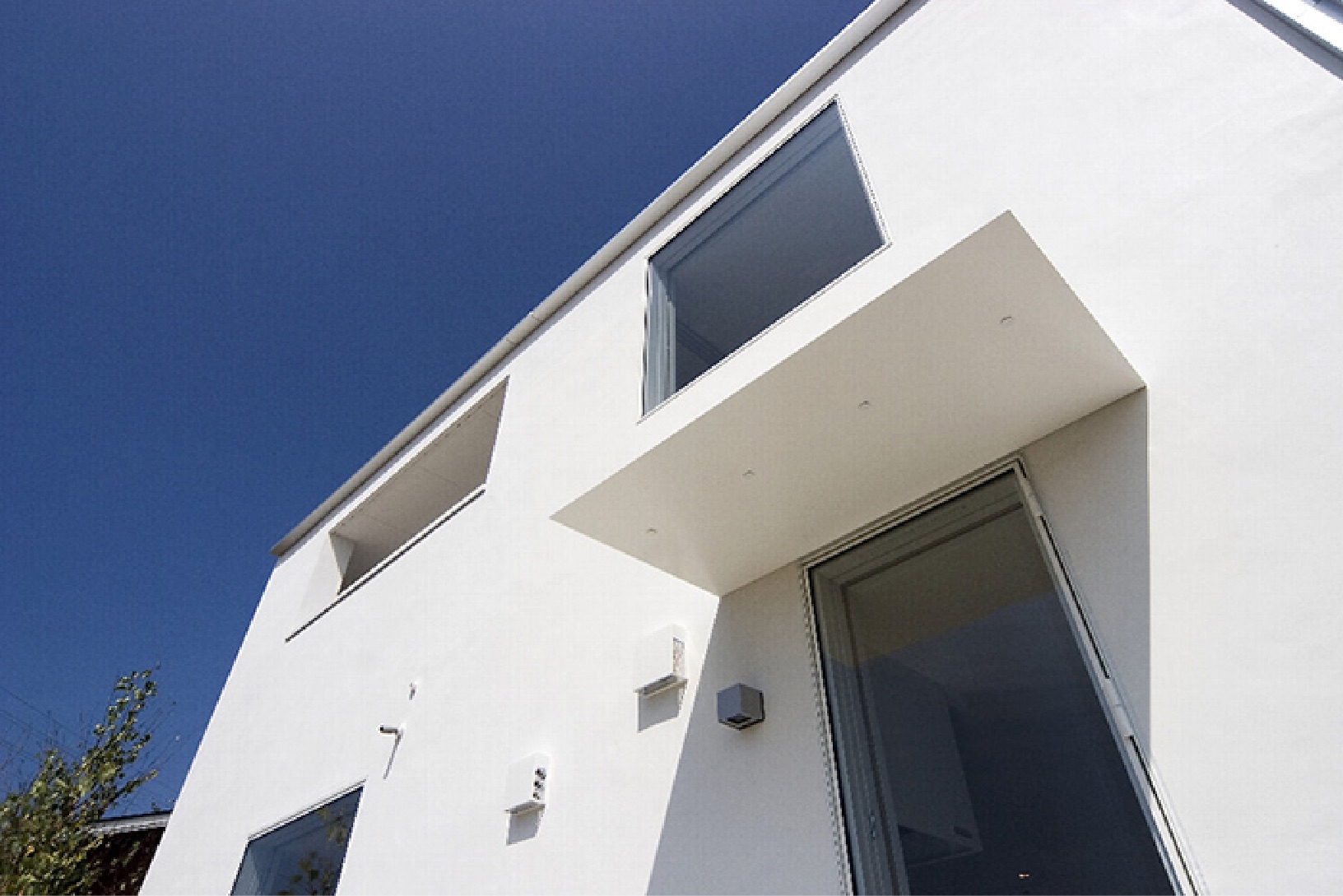 「窓の家」の特長は、白壁にナイフで切り取られたようなシャープな窓。好きな位置に、好きな大きさで窓を開けられるピクチャーウィンドウです。
