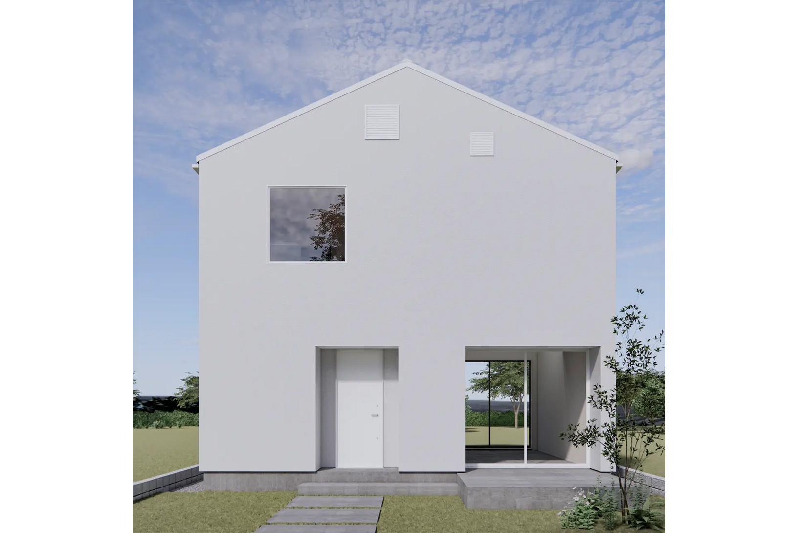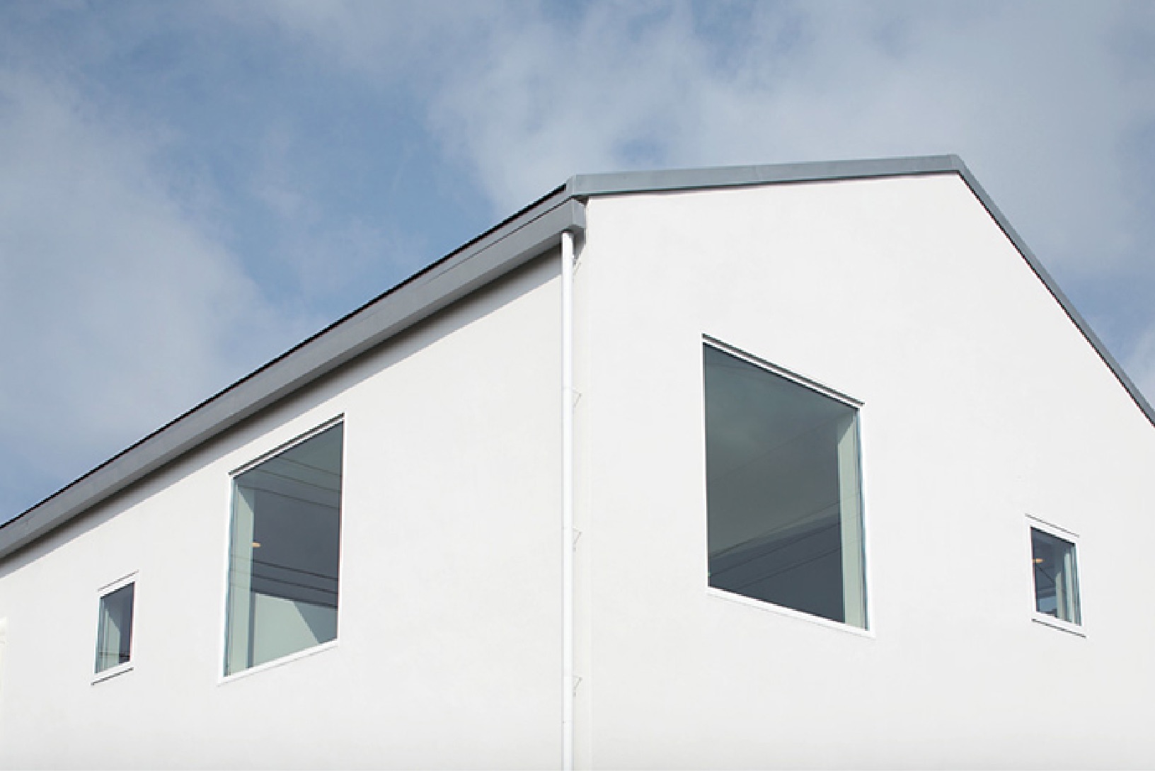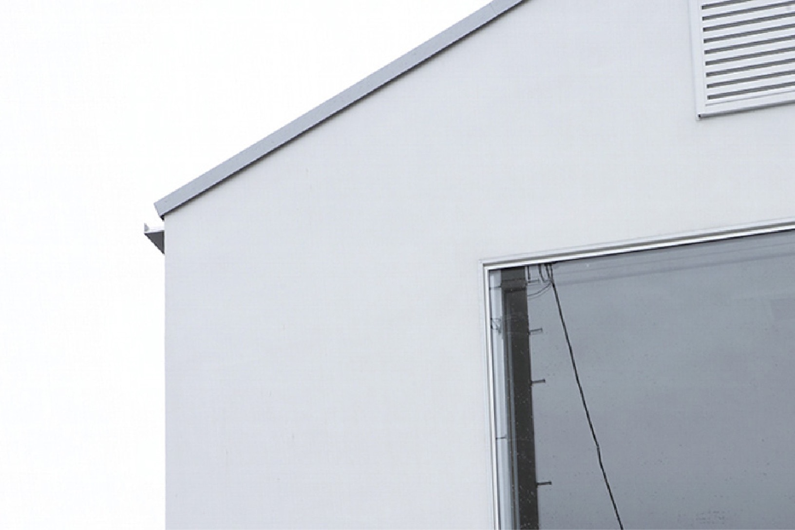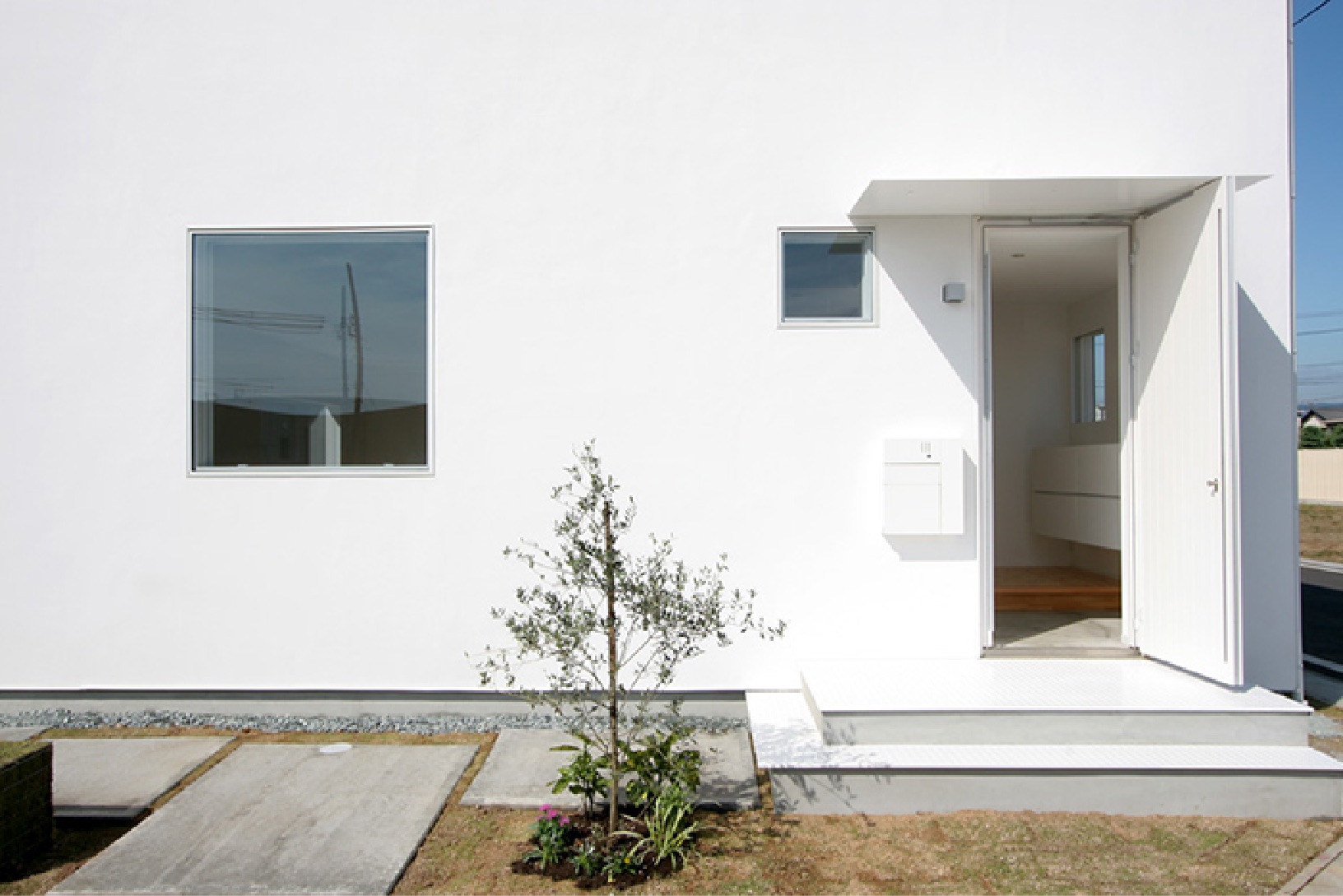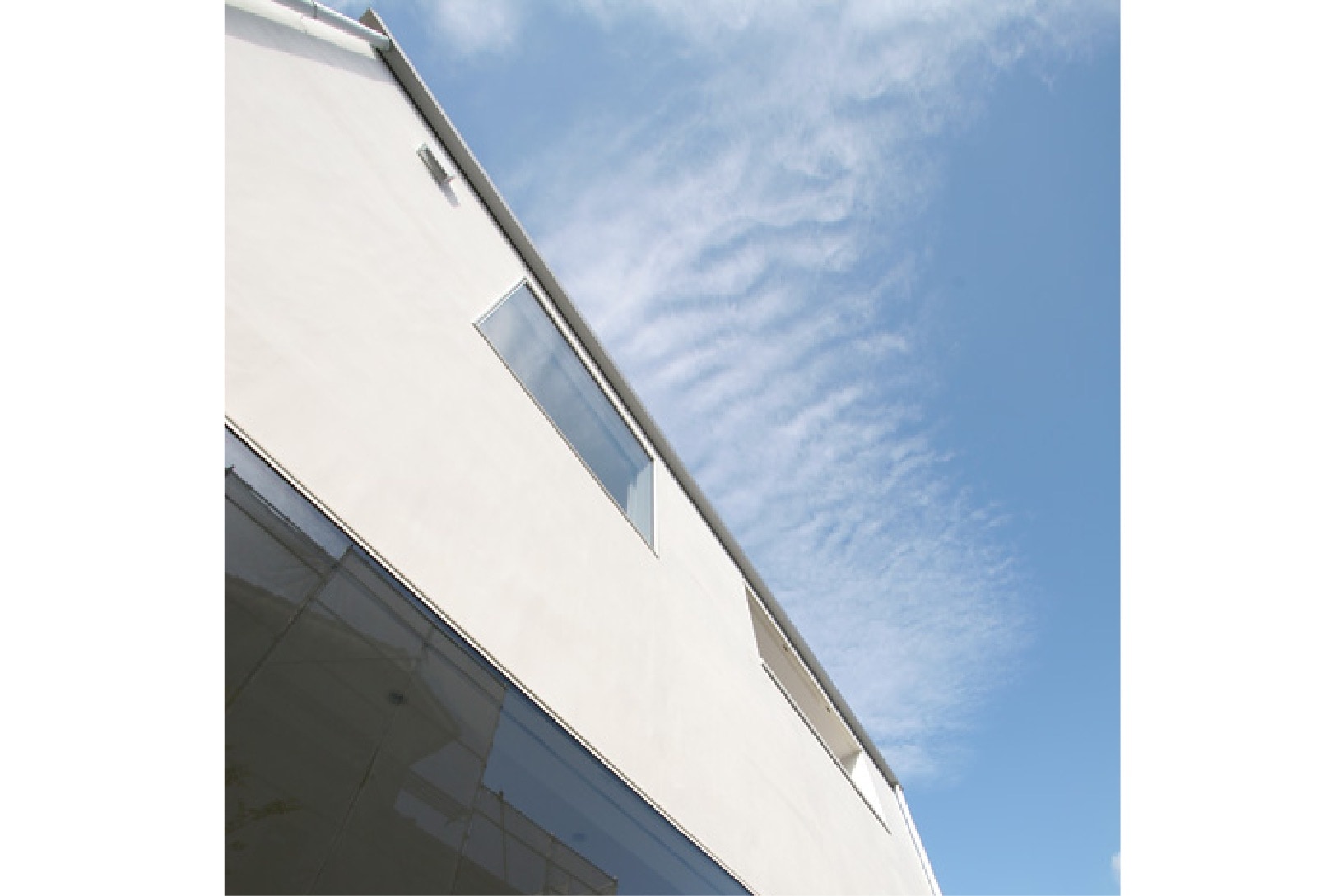 「窓の家」の特長は、白壁にナイフで切り取られたようなシャープな窓。好きな位置に、好きな大きさで窓を開けられるピクチャーウィンドウです。