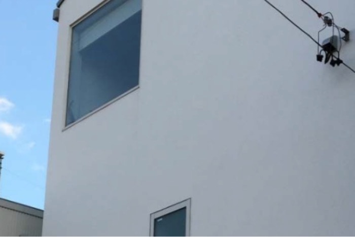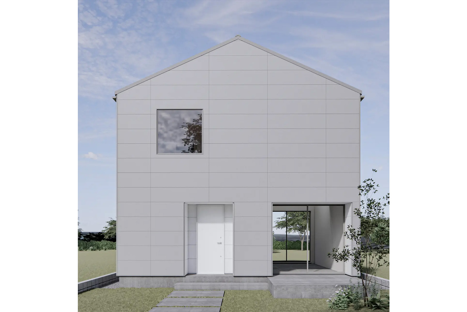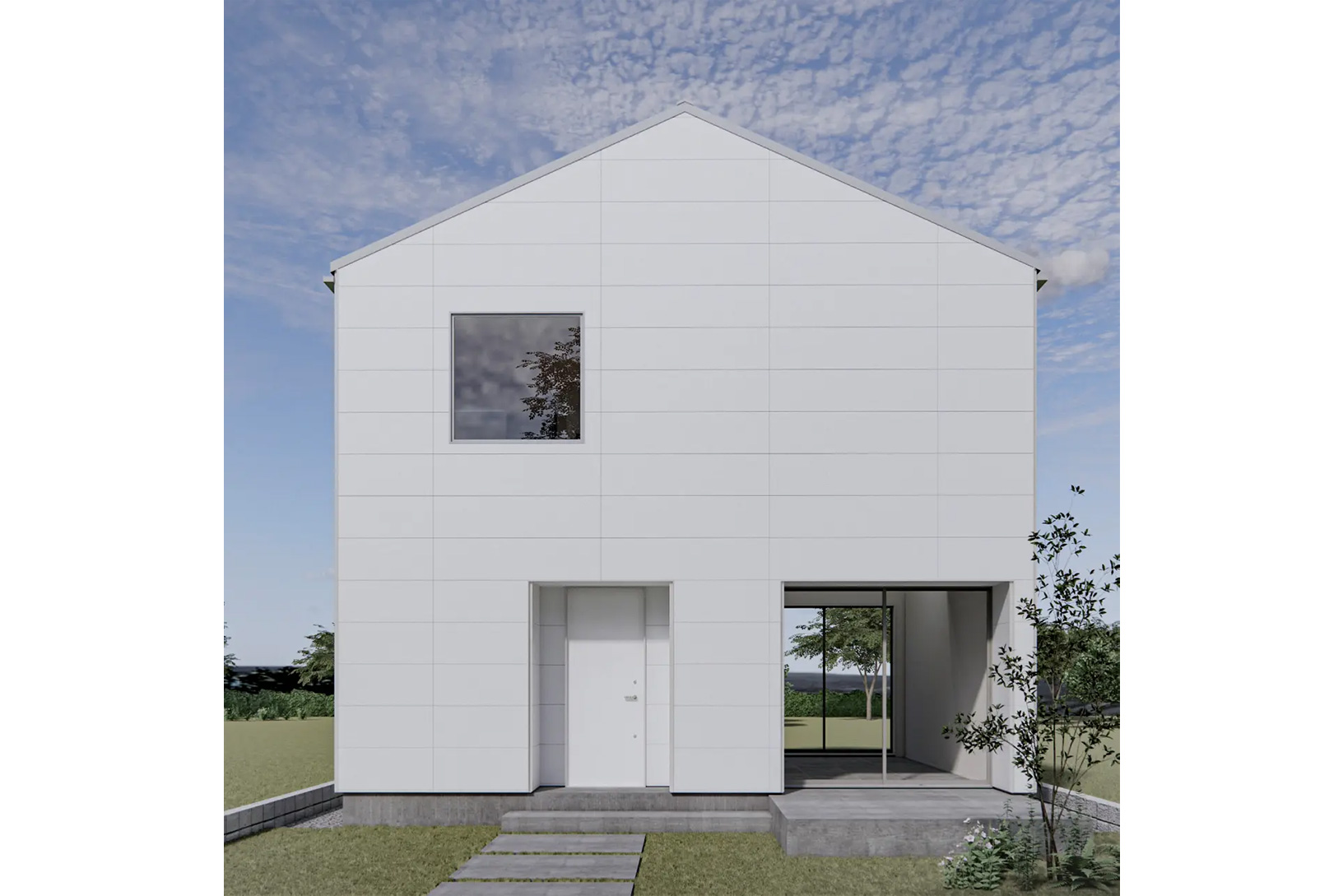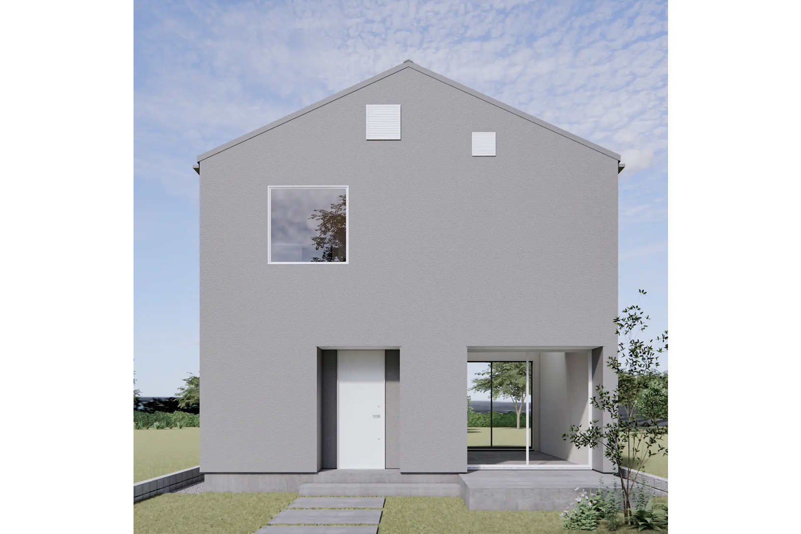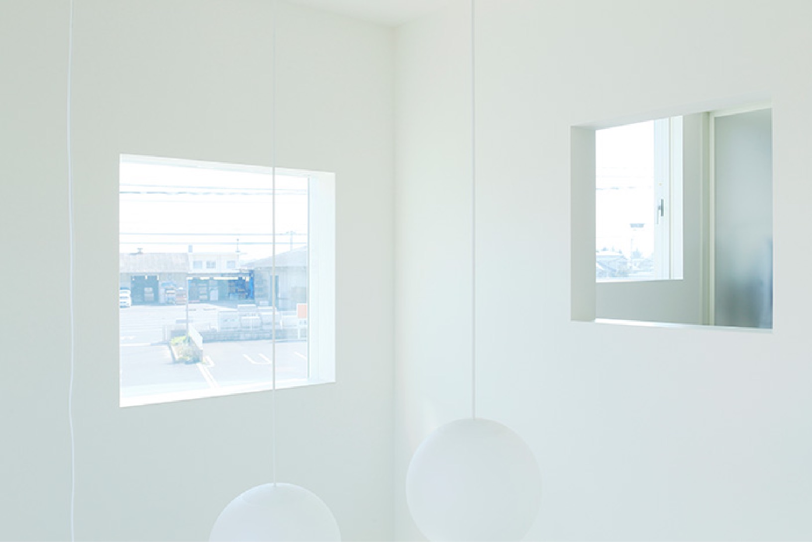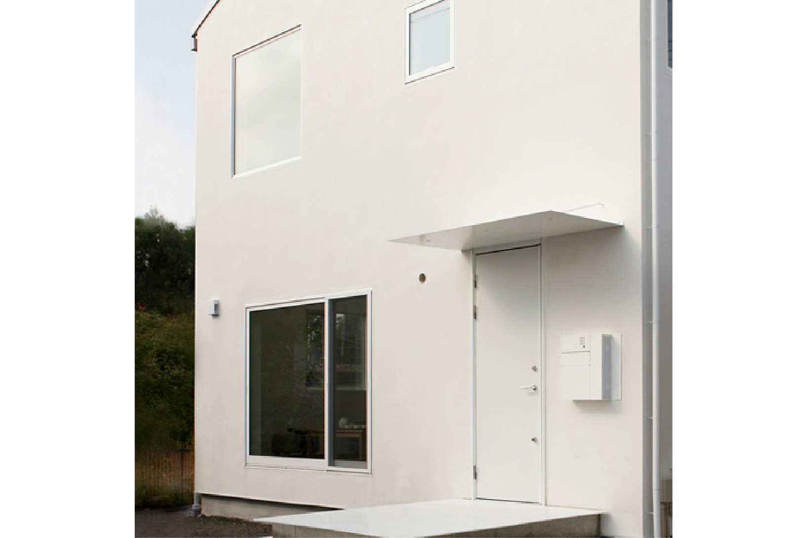 「窓の家」の特長は、白壁にナイフで切り取られたようなシャープな窓。好きな位置に、好きな大きさで窓を開けられるピクチャーウィンドウです。