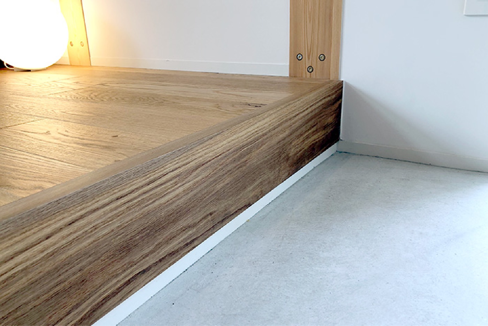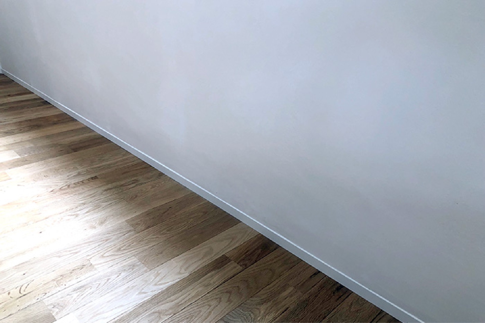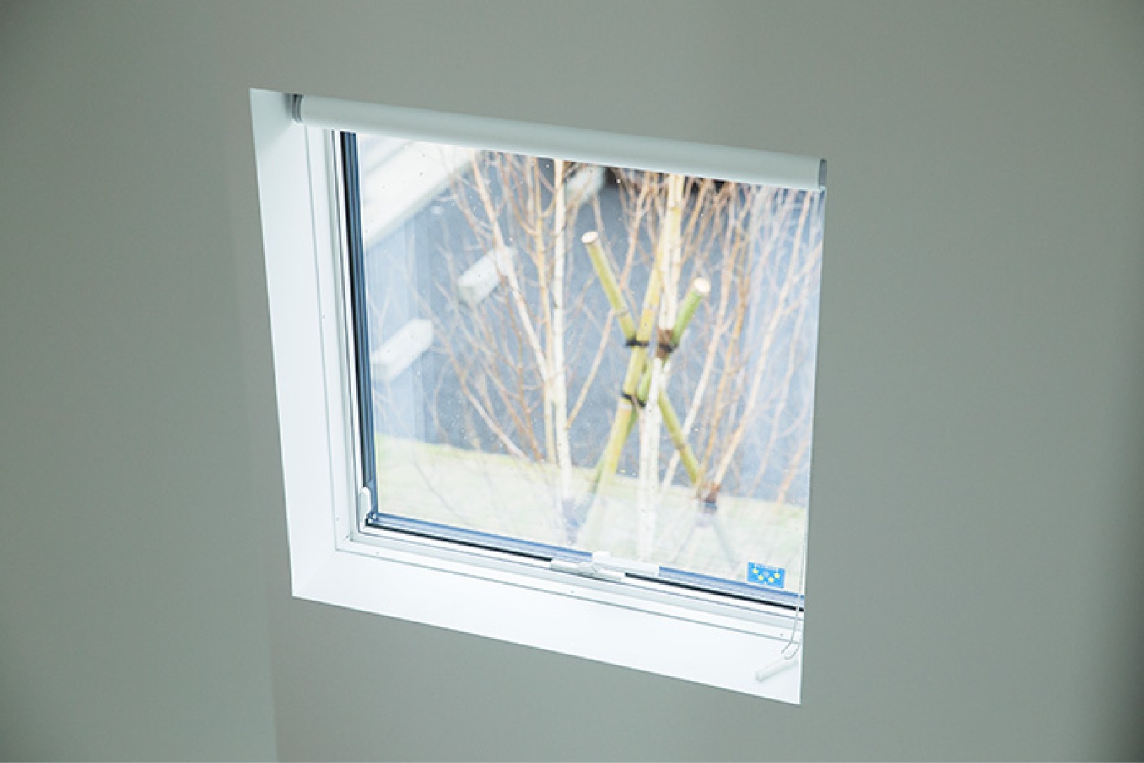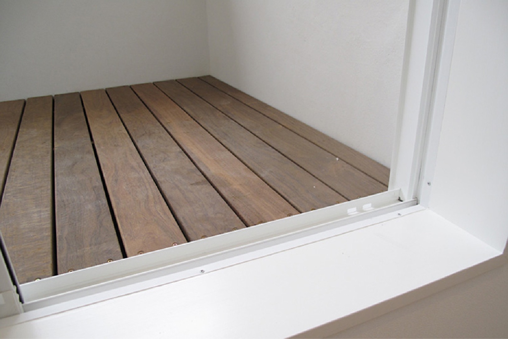 小窓は下枠のみ、拭き掃除を考慮し強度のあるアルミ製の板材を回していますが、このアルミ板は厚さわずか3ミリ。壁からのほんの1ミリだけ出すデザインで、ほとんど枠があることを感じさせないのが特長です。