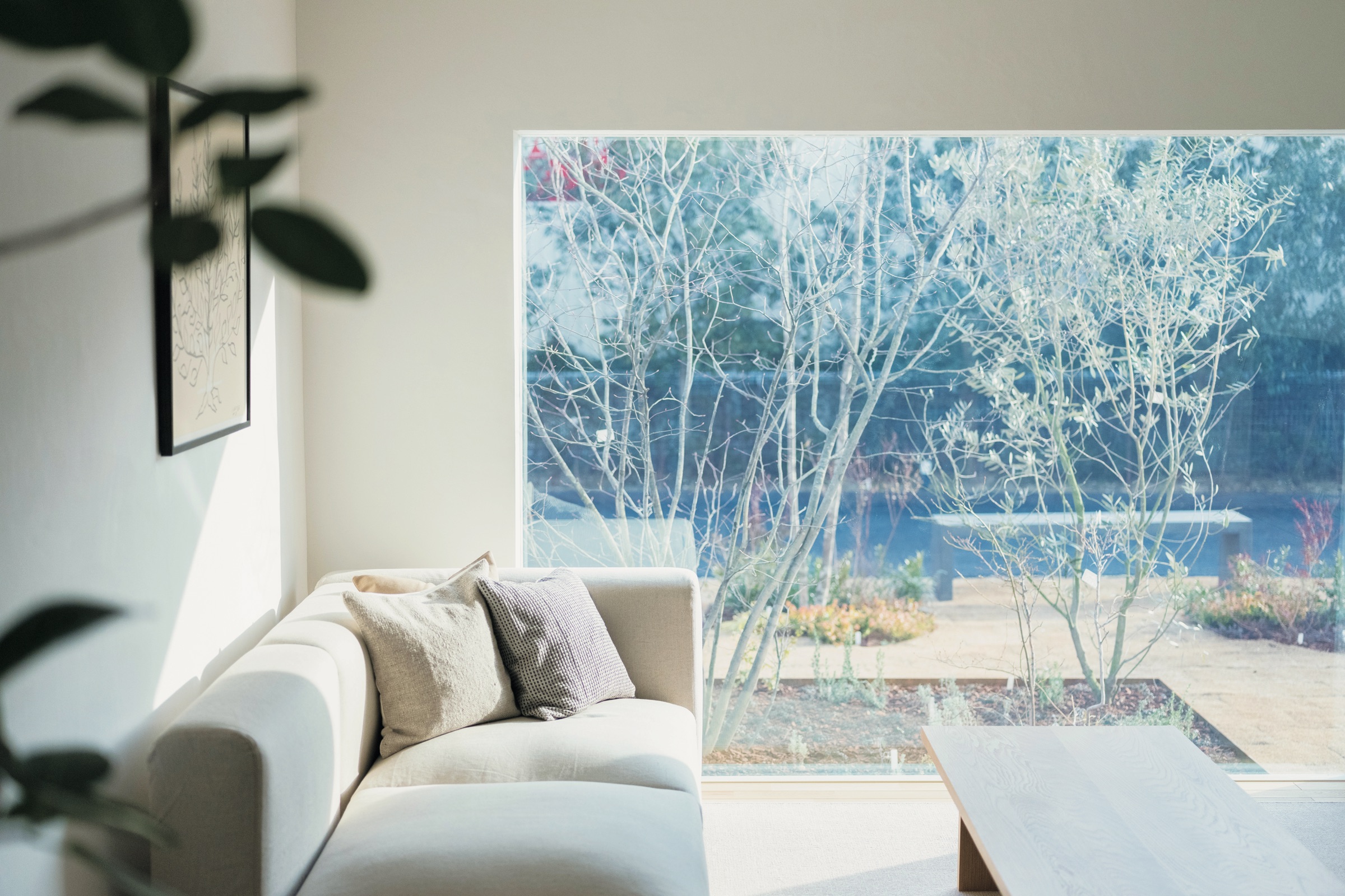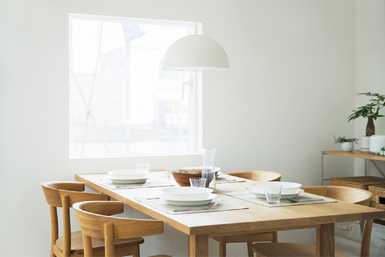 窓からの景色が一枚の絵画に見えるよう、目立つフレームをなくし、風景だけを切り取る「ピクチャーウィンドウ」。家に必要な要素を整理整頓した、まっさらで清廉な室内。室内窓は部屋と部屋、部屋と吹抜けをつないで光と風を通し、家族の気配も伝わります。
