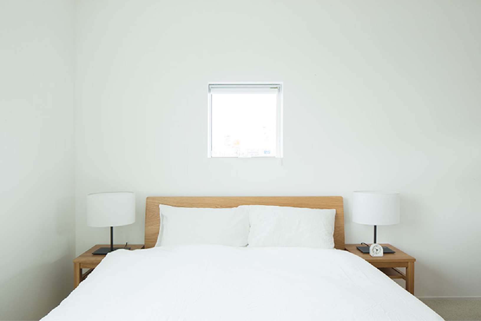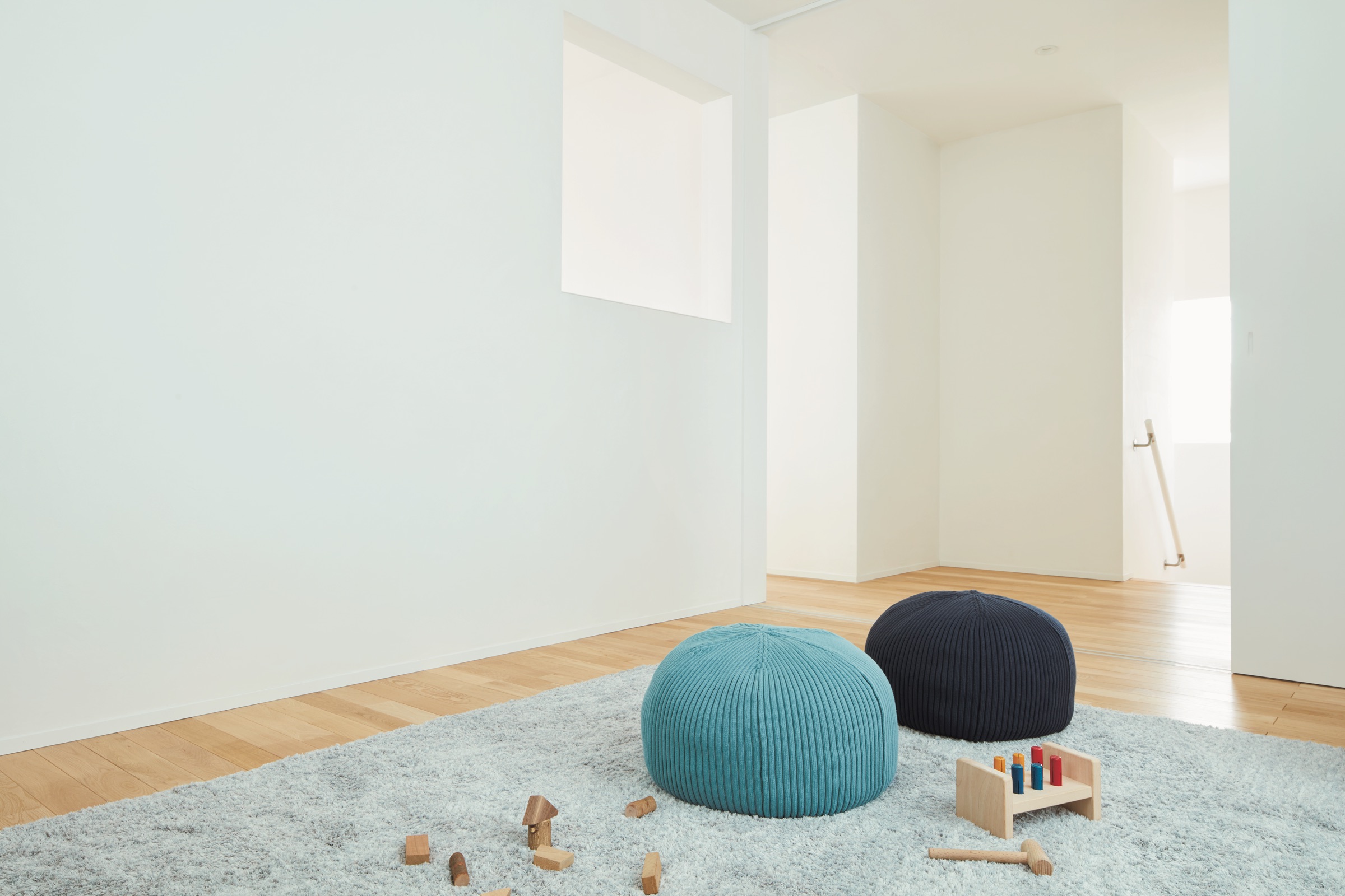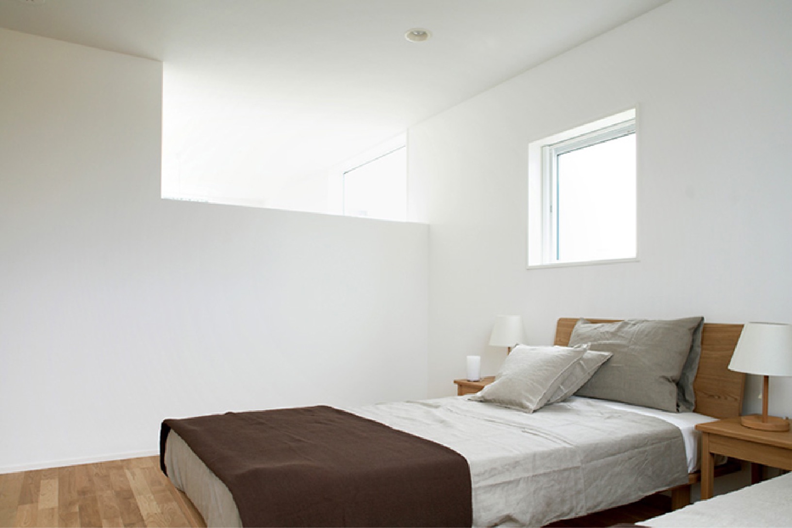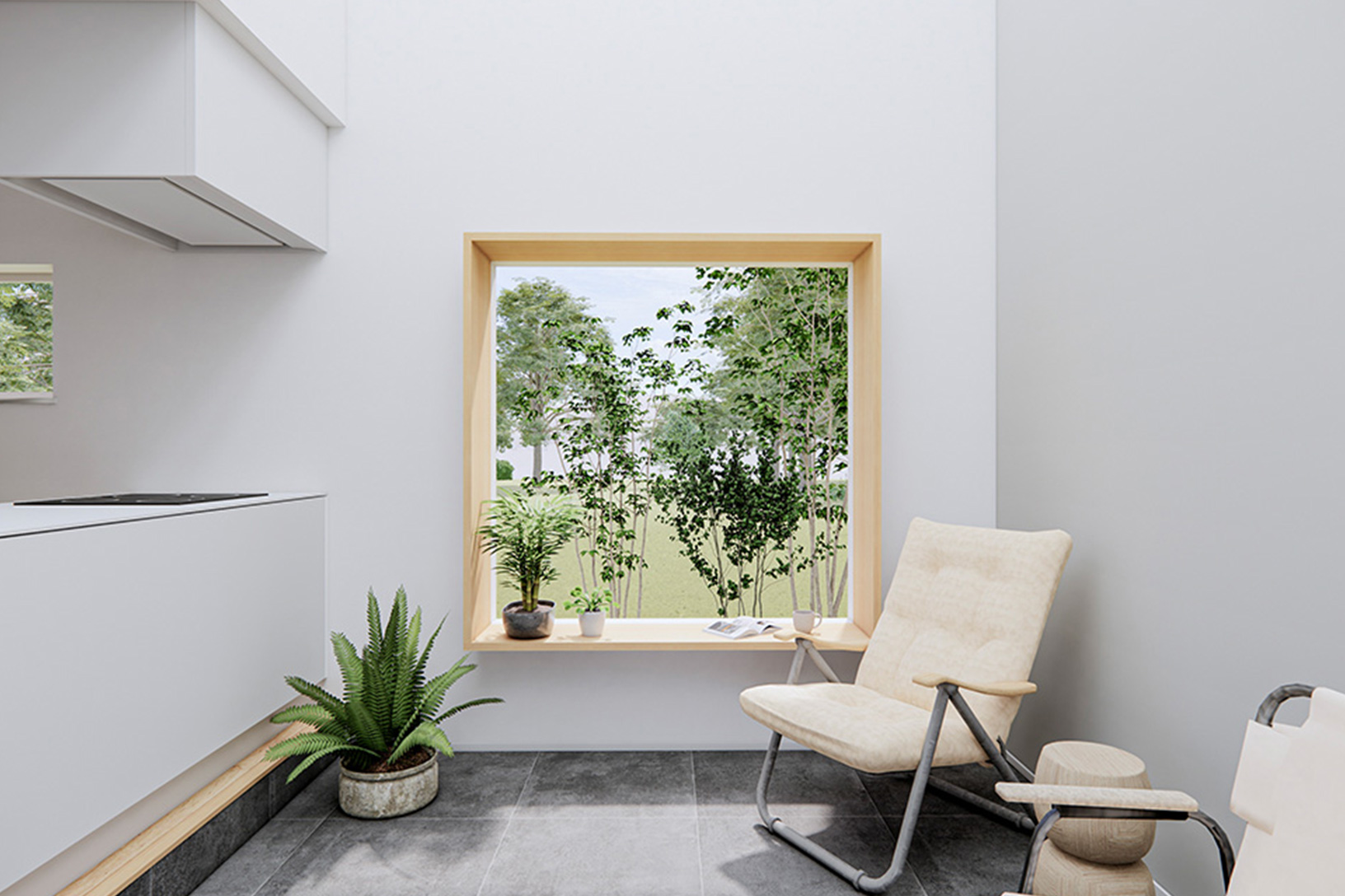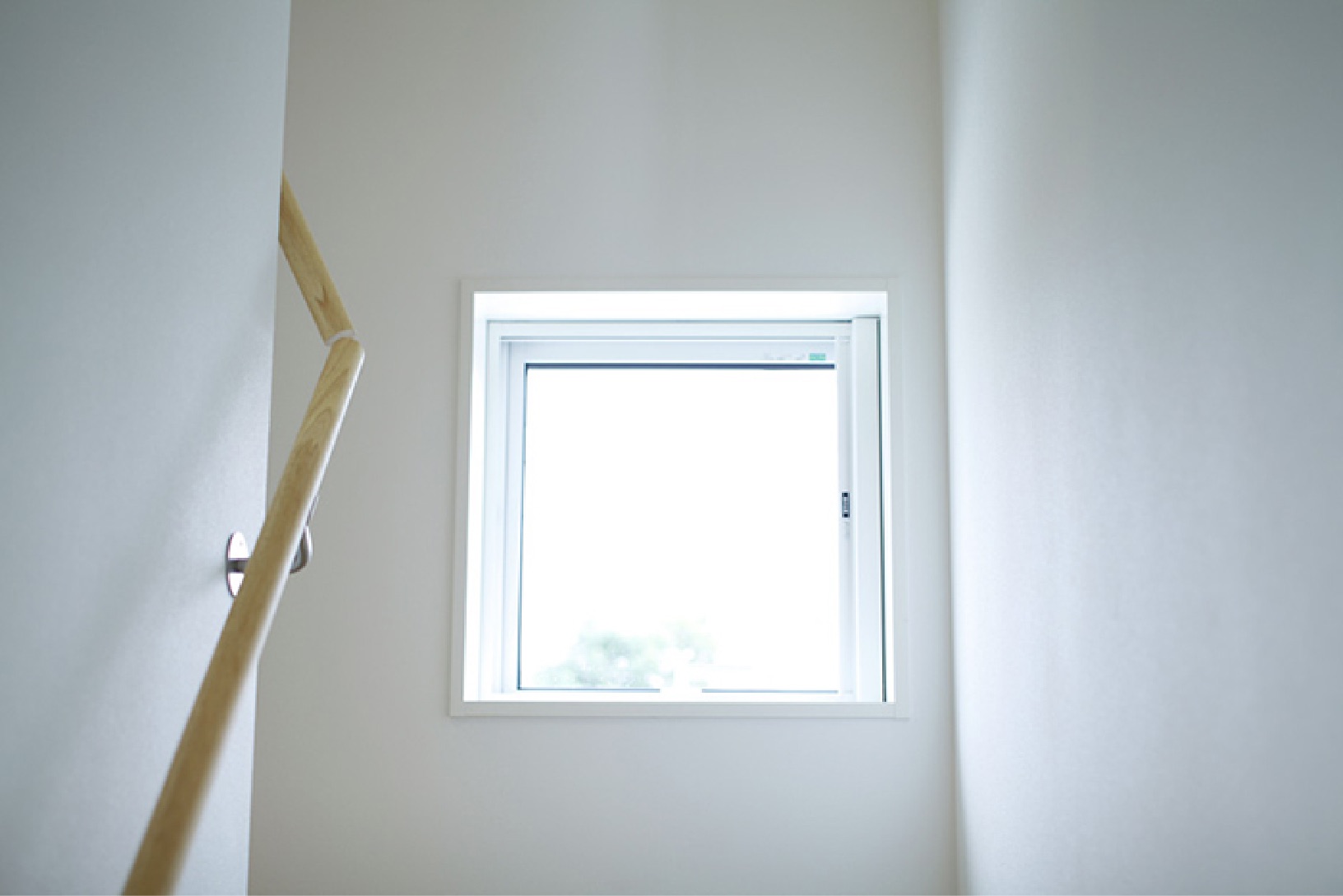 真っ白な壁をくりぬいて部屋の中に「窓」をつくることができる「窓の家」。室内にも窓を持つことで、家族それぞれが居場所を持っていてもそこに閉じこもるのではなくどこかでお互いの気配を感じ、ゆるやかにつながりながら暮らすことができます。視線を合わせずとも「ごはんですよー」「起きなさーい」「タオル持ってきてー」と、自然なコミュニケーションを生み、家族にちょうどいい距離感が生まれます。吹き抜けに向かって大きな窓を開ければ、小さな部屋でも広々と過ごすことができ、視線を外した高い位置に窓を開ければ、プライバシーを守りながらも空気や光を共有することができます。大きな吹き抜けからたっぷりと光が差し込んでくるので、室内はいつも明るく快適です。