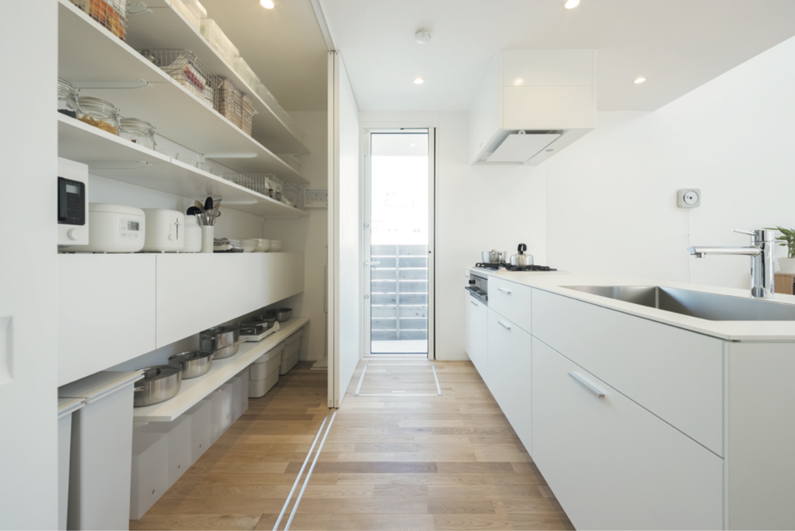 必要なものを必要な分だけそろえた無駄のないキッチンは、無印良品のダストボックスがすっきりと収まり、暮らしに合わせて収納を付け足し、自分流のキッチンにカスタマイズすることができます。
