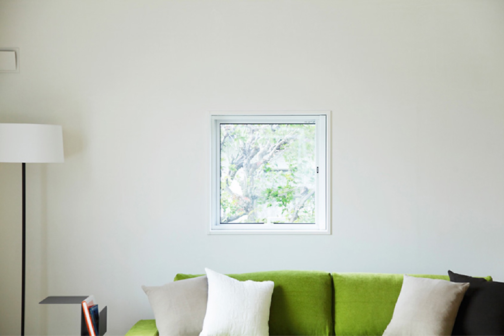 窓は何のためにあるのでしょうか。太陽の光を取り入れるため、風を通すため、外の様子を知るため……窓に求められる役割はさまざまです。屋根と壁で暮らしを守ってきた“住宅”の歴史で、最初の窓は、石積みや土を固めた壁面に穴を開けたことに始まります。窓は、家の外と内をつなぎ、光を室内に取り込む穴でした。やがて、壁の穴から見渡せる外の光景は、家の中で暮らす者の共通の視点となり、それを楽しむ心が育まれていきます。日本には、四季の移り変わりをそのまま暮らしに取り込むのではなく、窓で切り取り、美意識にかなう風景として愛でてきた文化があります。無印良品はその考え方に、日本人の窓の原形を見出しました。住まい手の美意識に合わせて自在に窓を設け、外とつながる自由を大切にしました。「窓の家」の窓には目立つフレームがありません。光がほしい場所に光を、家族が語り継ぐ風景を、壁に四角い窓を開けるという、もっともシンプルなかたちで実現した住まいです。サッシにはトリプルガラスを使用した断熱性能が高いタイプを採用しているので、気密断熱性能を損なうことなく、大きな窓を設けることができます。