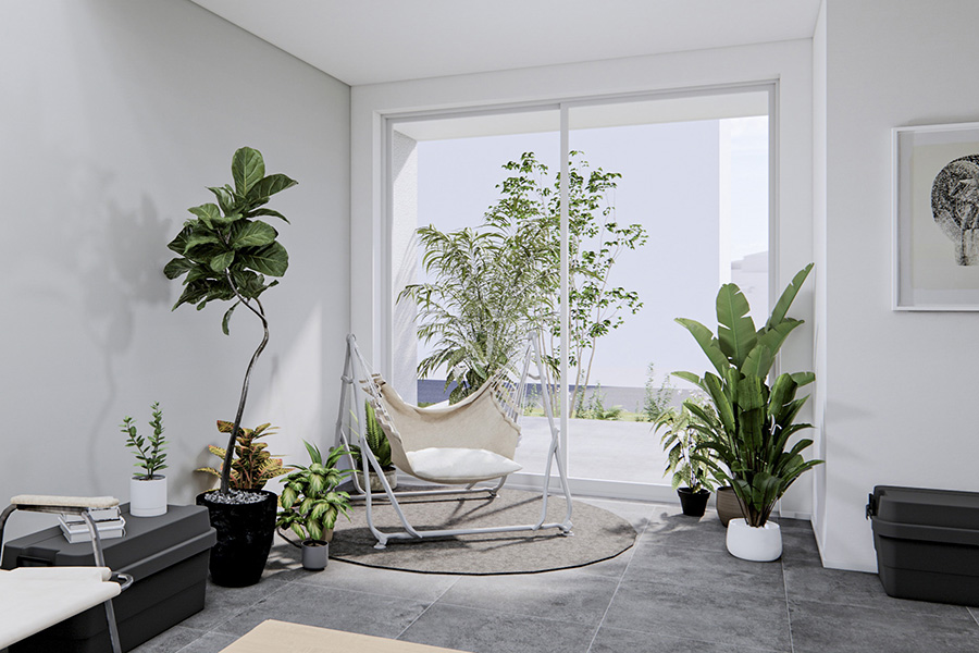 そこで、広い土間を設置することで、プライバシーを保ちながら外とのつながりを感じられる空間に。お気に入りのインテリアを設置してリビングとして使用することもできます。