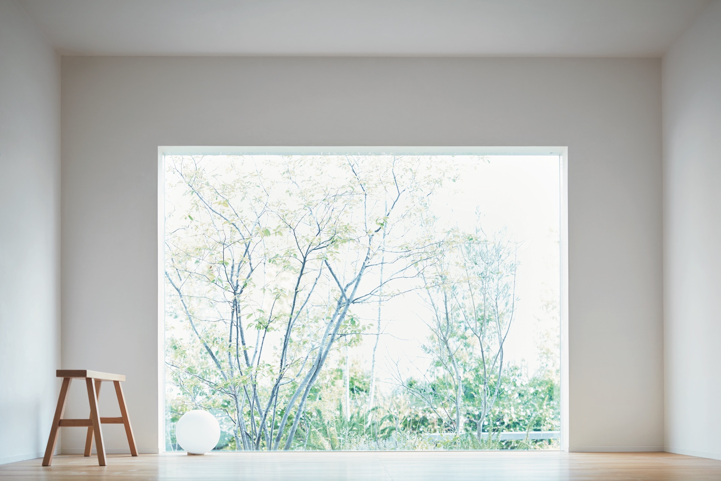 窓からの景色が一枚の絵画に見えるよう、目立つフレームをなくし、風景だけを切り取る「ピクチャーウィンドウ」。家に必要な要素を整理整頓した、まっさらで清廉な室内。室内窓は部屋と部屋、部屋と吹抜けをつないで光と風を通し、家族の気配も伝わります。