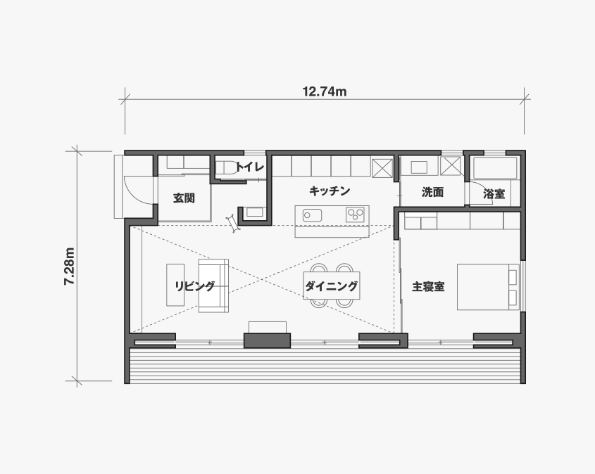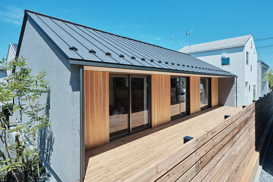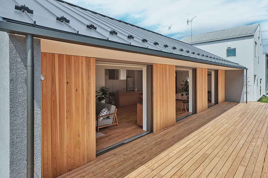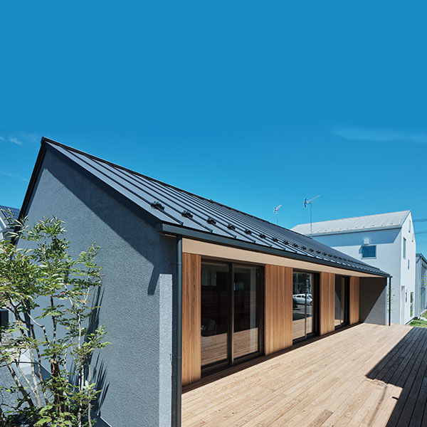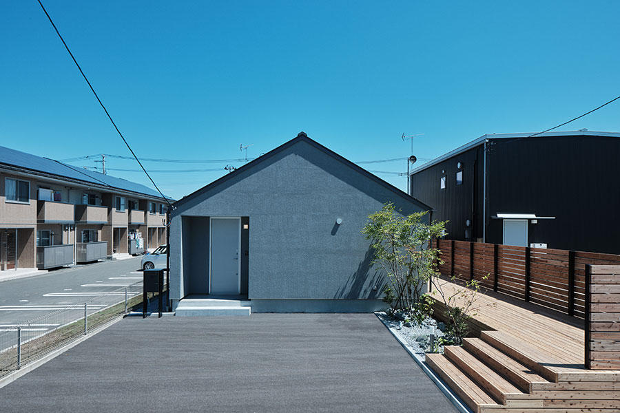 東北地方初「陽の家」モデルハウスです。7間×4間、延床面積22.16坪です。外壁の仕様はグレーの塗り壁、南面のみ杉板張りとなっております。「陽の家」では、窓を完全に壁の中に収納できる全開口サッシを採用しました。大きな窓の自在な開閉が、庭をより身近に感じさせ、庭の使い方も広がります。リビング・ダイニング上部は、屋根の外形がそのまま現れた勾配天井となっております。平屋でありながら開放感のある一室空間です。南面の大きな開口を介して、室内だけに留まらず外にも延長し、庭はリビング空間に生まれ変わります。室内床と段差をつけずにウッドデッキに出られ、室内と屋外をゆるやかにつないでいます。初めて購入する家としても、子どもたちが巣立ったあとの、終の住処でも、二拠点居住の別荘にしてもいいでしょう。「陽の家」は快適に暮らせる家の、気持ちのいい答えになっているはずです。フラットな一室空間の「陽の家」、ぜひご覧ください。
