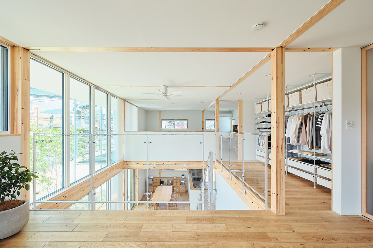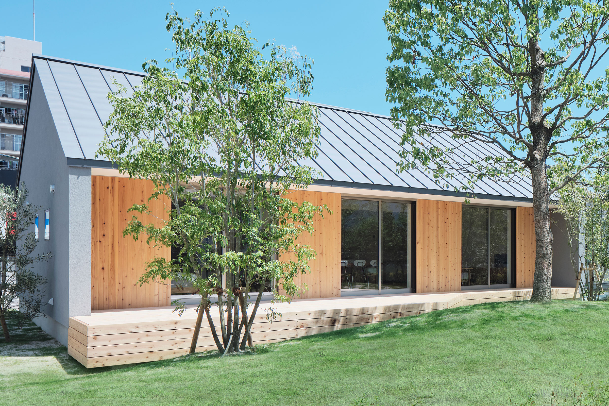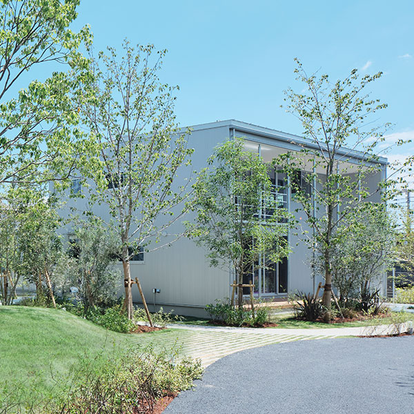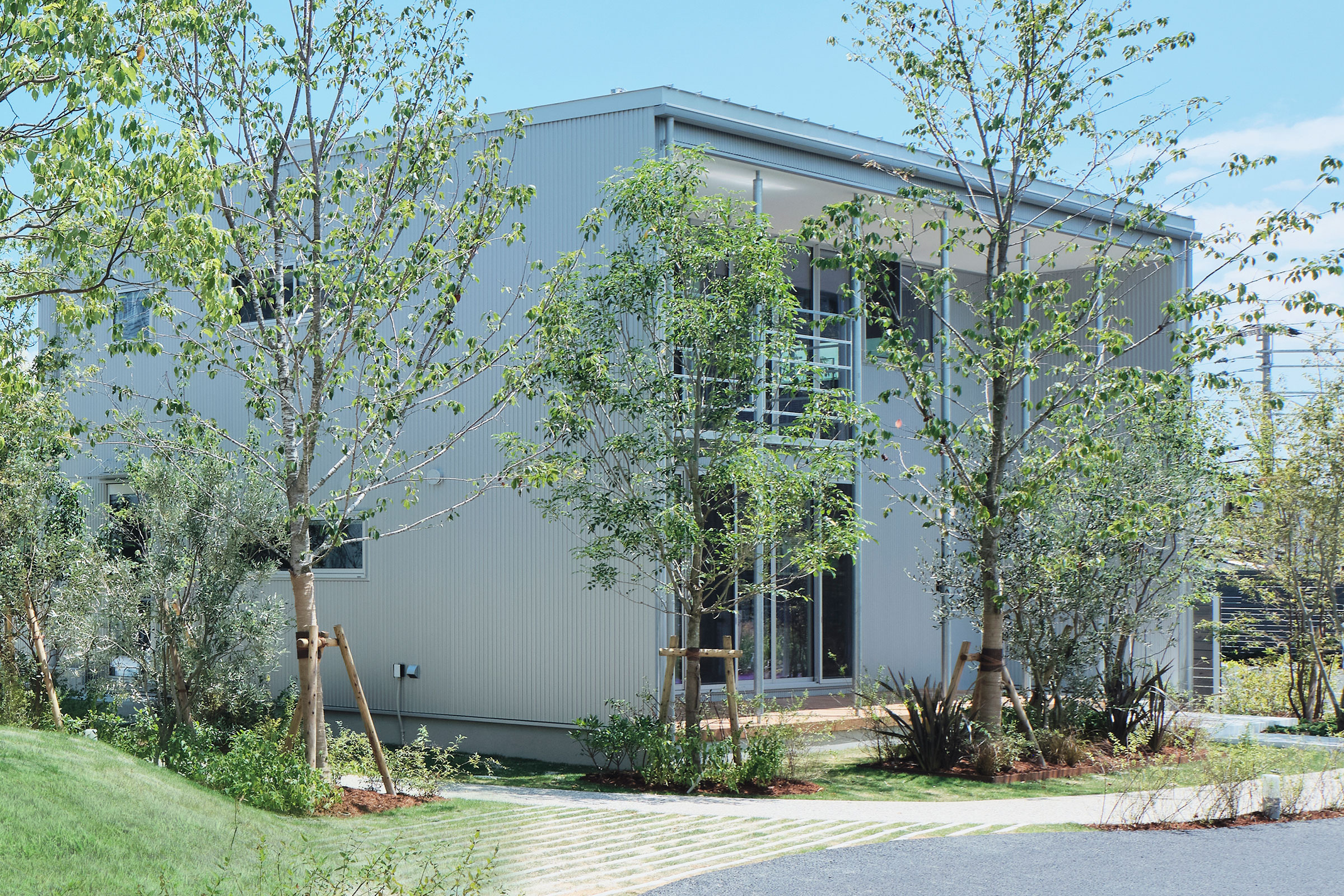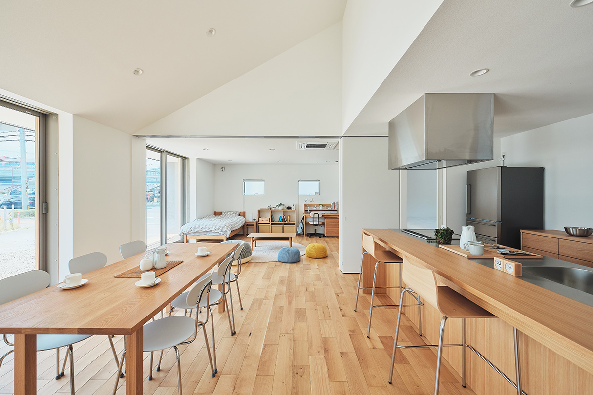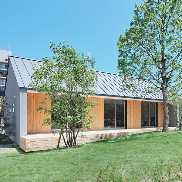 6.5間×5.25間(11.83m×9.555m)のモデルハウスです。外観はグレー色の塗り壁×杉張りを採用し、都会の雰囲気にもマッチする木の良さを生かした仕上げにしています。室内はリビングの開放感を演出する勾配天井や平屋ならではの生活動線を体感していただけます。