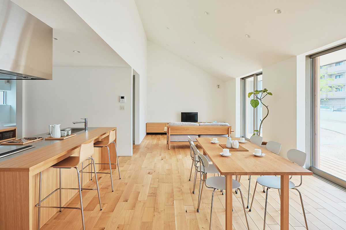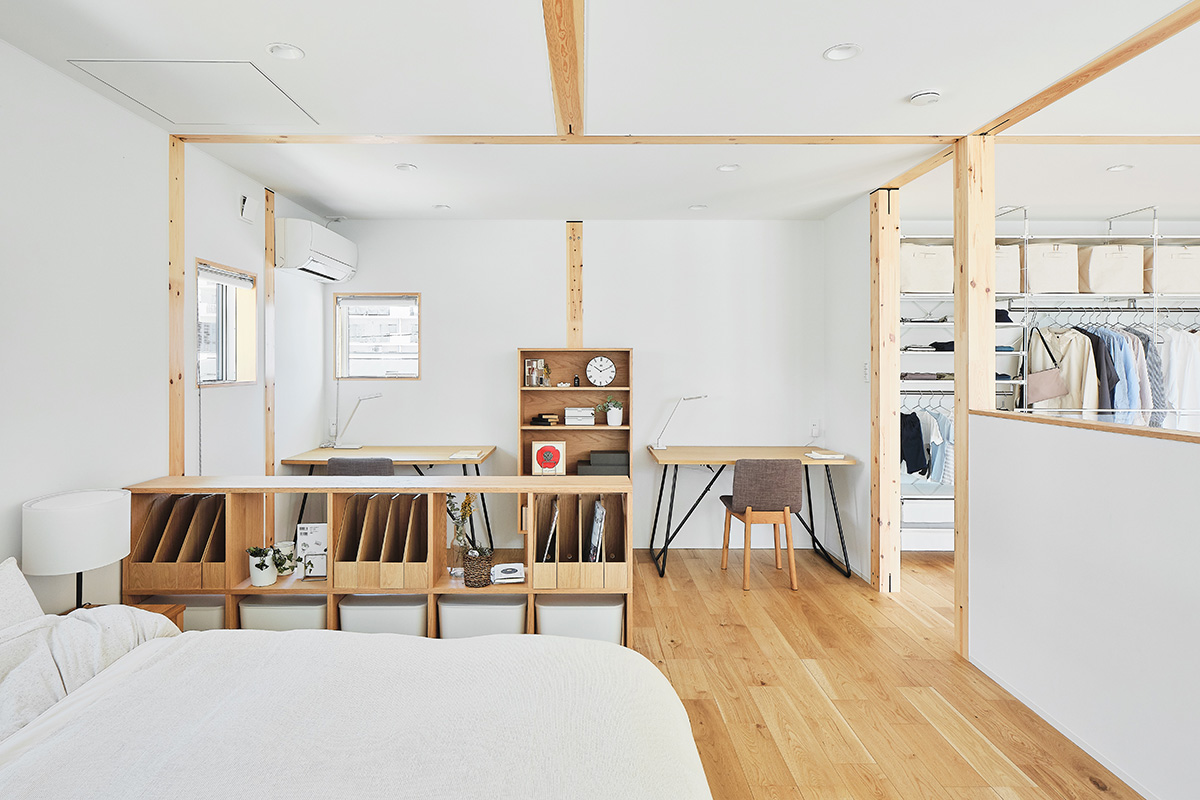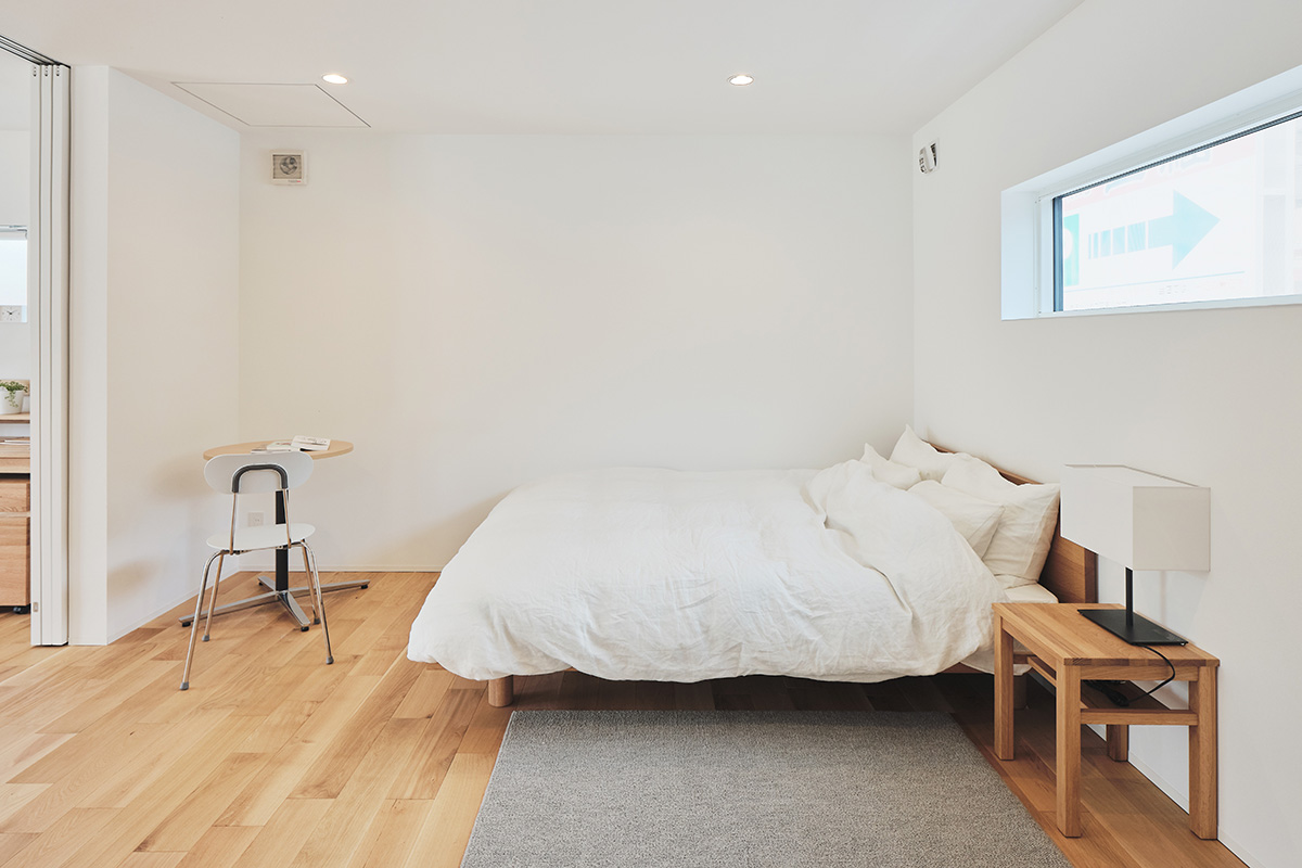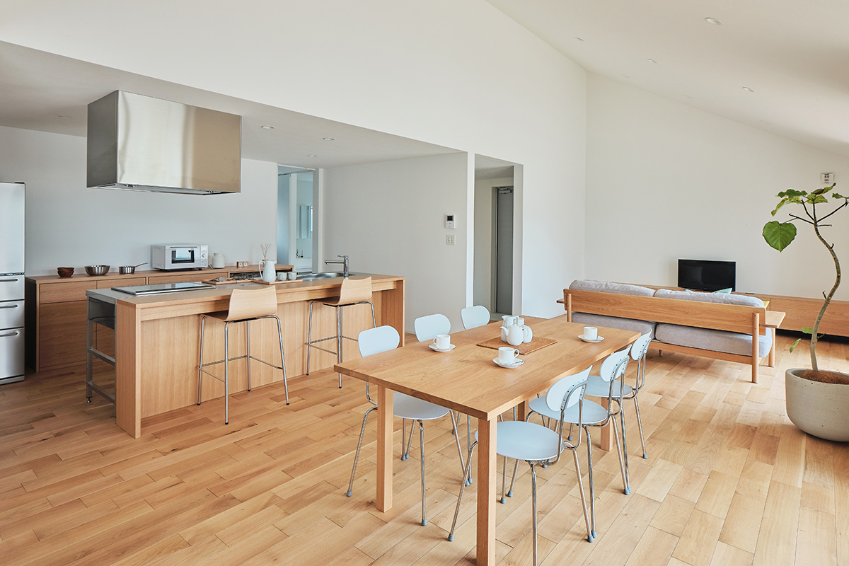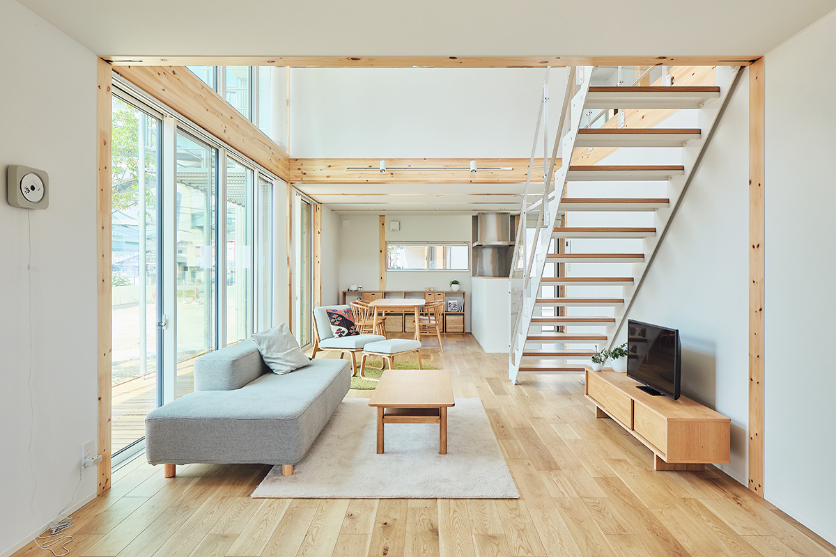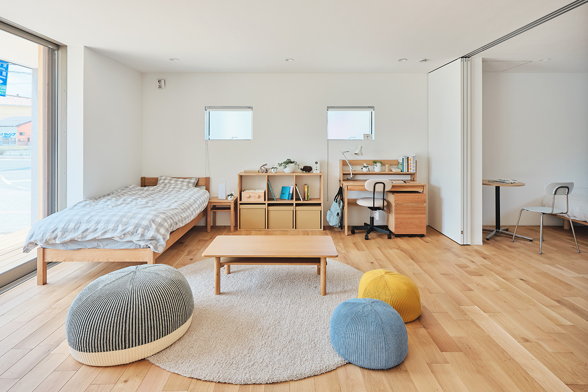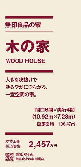 6間×4間(10.92m×7.28m)のモデルハウスです。外観はホワイト色でシンプル、室内は木の香り漂う8帖の吹抜けと開放的な空間で、機能的なデザインや仕様は、細部まで無印良品のこだわりを詰め込みました。