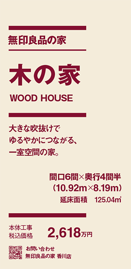 無印良品の家 香川店は、6間×4間半の広々とした空間の中にも、暮らしの安らぎを感じさせる「木の家」モデルハウスです。シンプルで飽きの来ないデザインと、SE構法による高い耐震性や丈夫な構造、コーナー窓を活かした外観や大きな吹抜けで開放感のあるゆったりとしたLDK、アイランドキッチンやファミリークローゼット。そして新仕様のダブル断熱とトリプルガラスを標準とした高断熱性能。今後の住まいに必要とされる、次世代の住宅性能の基準まで見据え、新たに生まれ変わった香川店をぜひご体感ください。