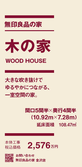5間半×4間半(10.01m×8.19m)、施工面積46坪のモデルハウスになります。外観はシンプル、室内は木の香り漂う10帖の吹き抜けと開放的な空間で、機能的なデザインや仕様は、細部まで無印良品のこだわりを詰め込みました。
