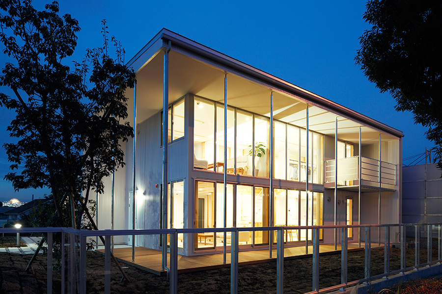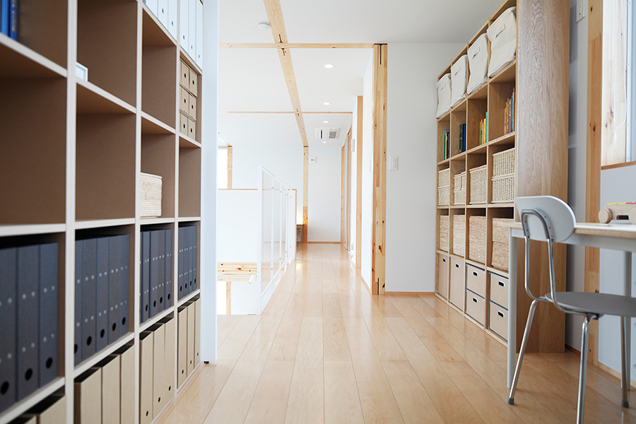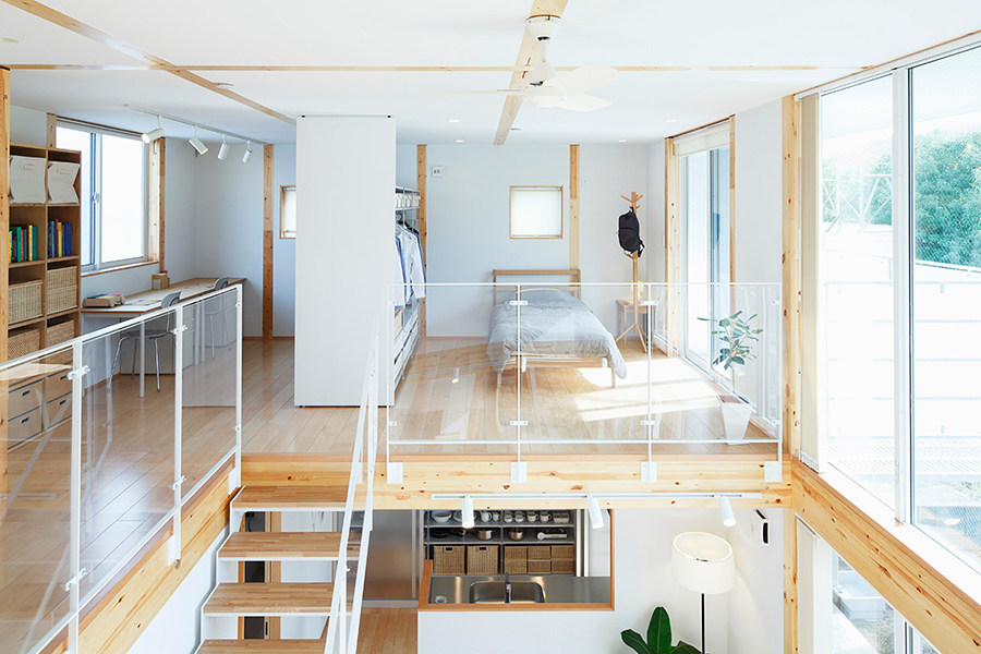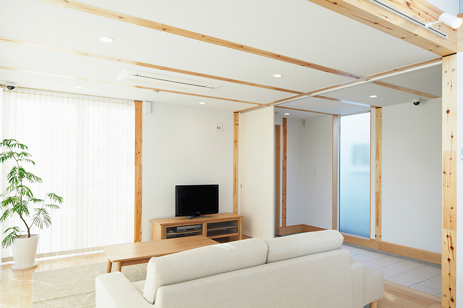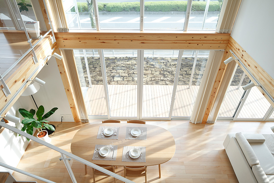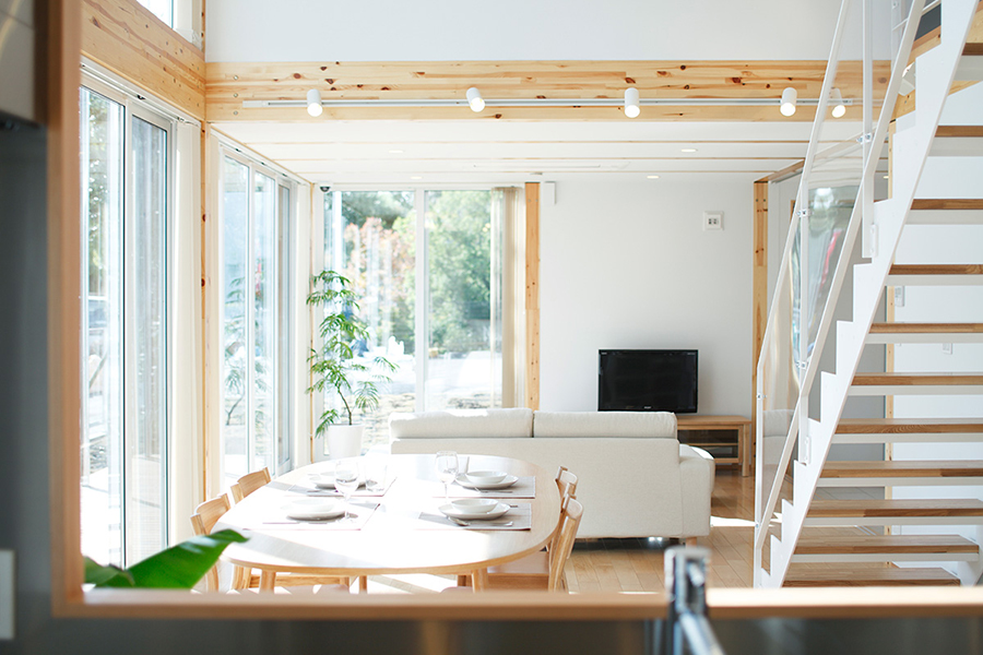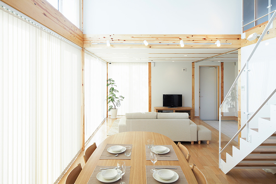 「木の家」の特徴である大きな開口から、軒を通してふり注ぐやさしい光が家族を包み込みます。毎日行う家事を楽しくできるよう考えた女性にやさしい生活動線。吹抜けの空間からつながる家族の絆。笑顔の絶えないファミリーをイメージした等身大のモデルハウスです。