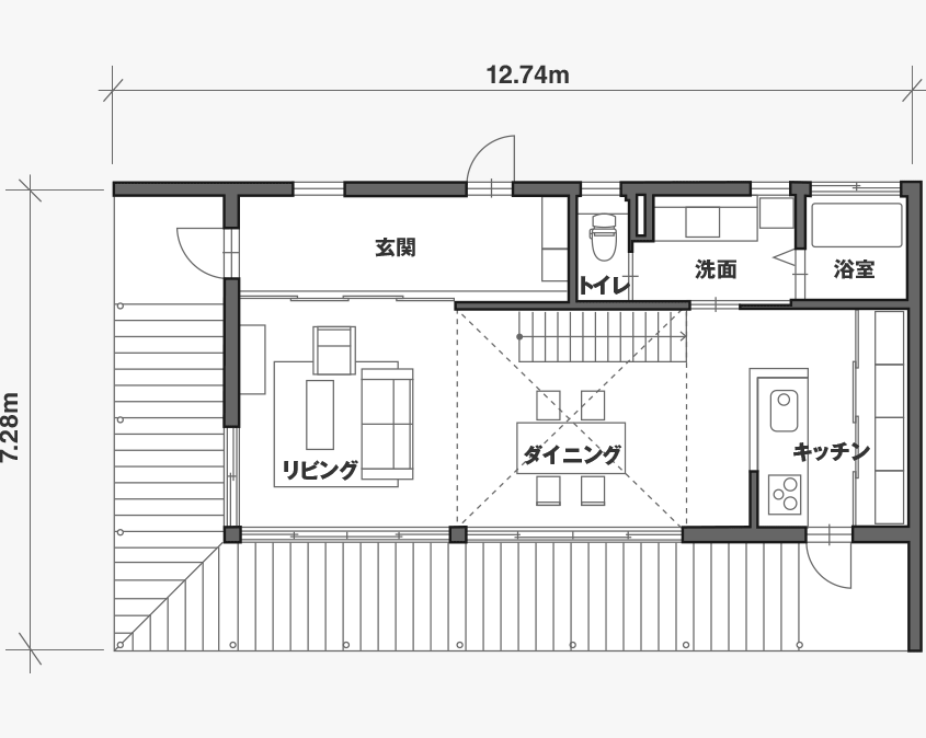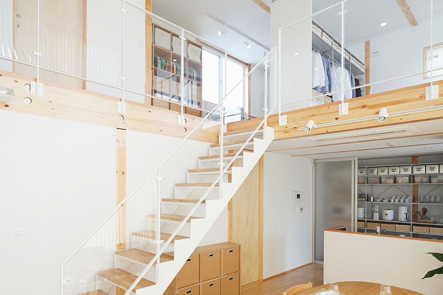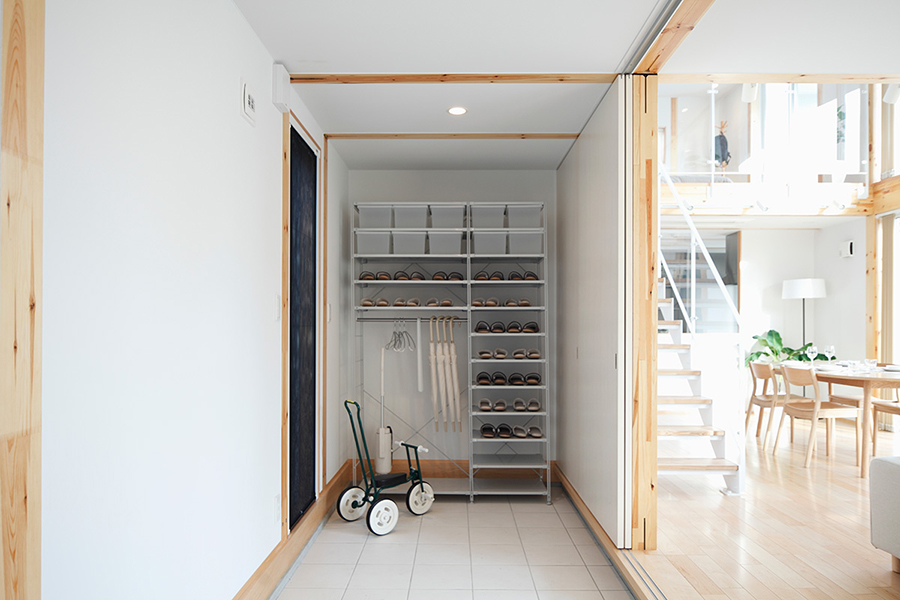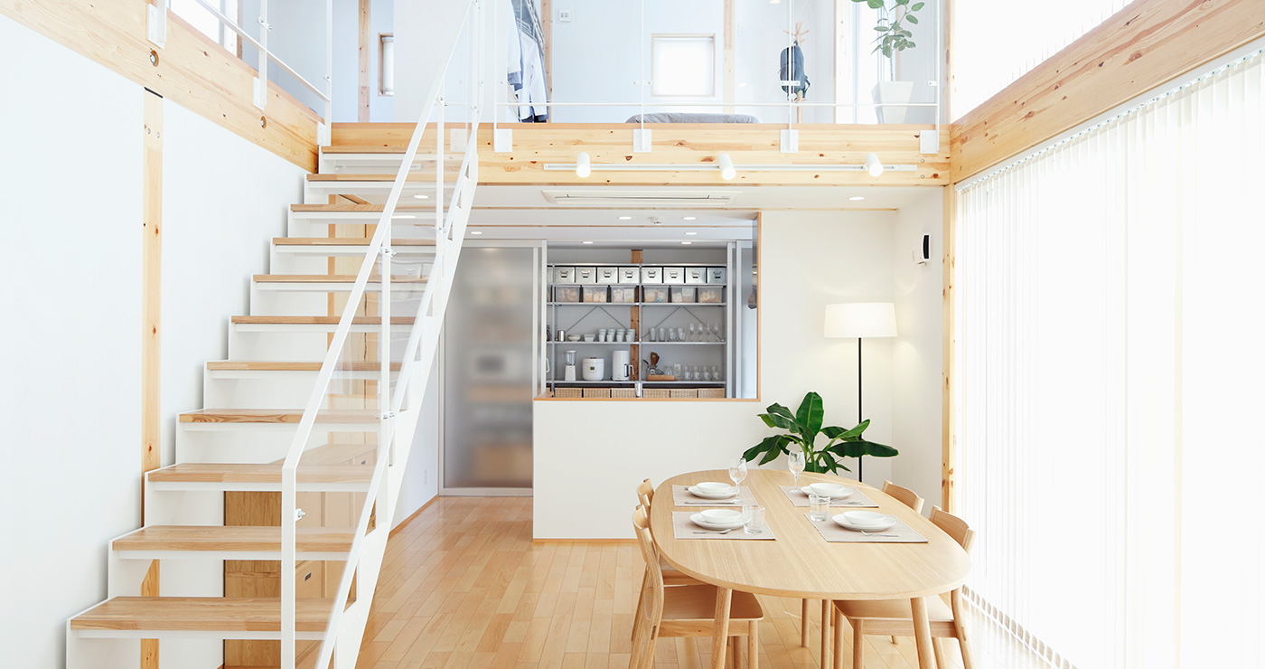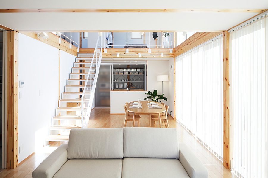 大きな玄関土間からLDKへ広がる一室空間が、お客様を気持ち良く出迎えます。吹抜けのリビング階段、対面キッチンが家族の会話と笑顔を作り出します。