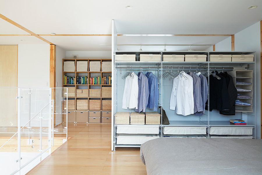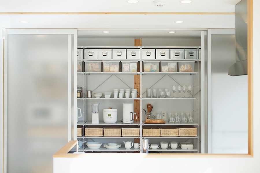 毎日使うキッチンは効率の良い家事動線。様々なタイプのユニットシェルフ・スタッキングシェルフで満足のできる収納計画です。