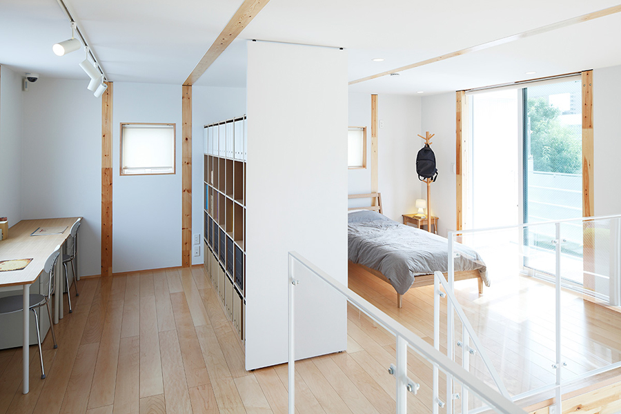 木のぬくもりを感じるあらわし仕上げの内装に、無垢の家具を配置。落ち着いた雰囲気を演出しています。1階と2階、床の色と家具の色を変えていますので、一室空間の中で違った雰囲気を体験できます。