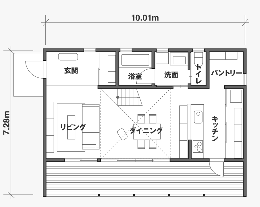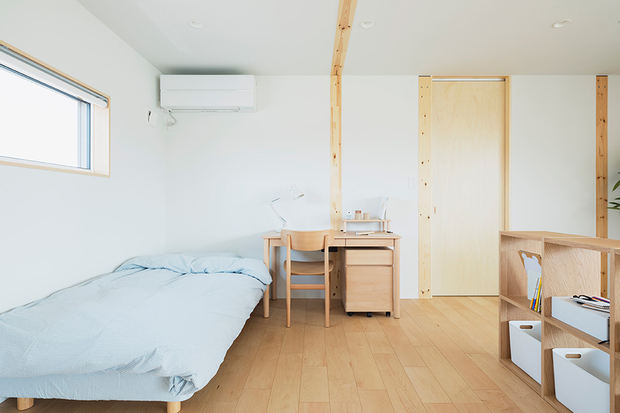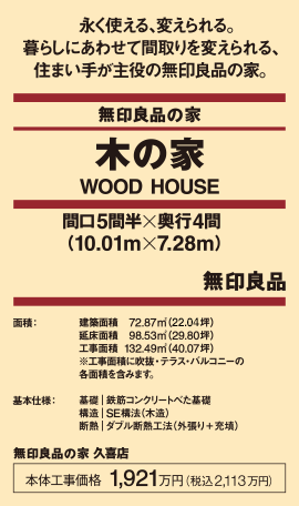 5間半×4間(10.01m×7.28m)のモデルハウスです。外観はシンプル、室内は木の香り漂う8帖の吹抜けと開放的な空間で、機能的なデザインや仕様は、細部まで無印良品のこだわりを詰め込みました。