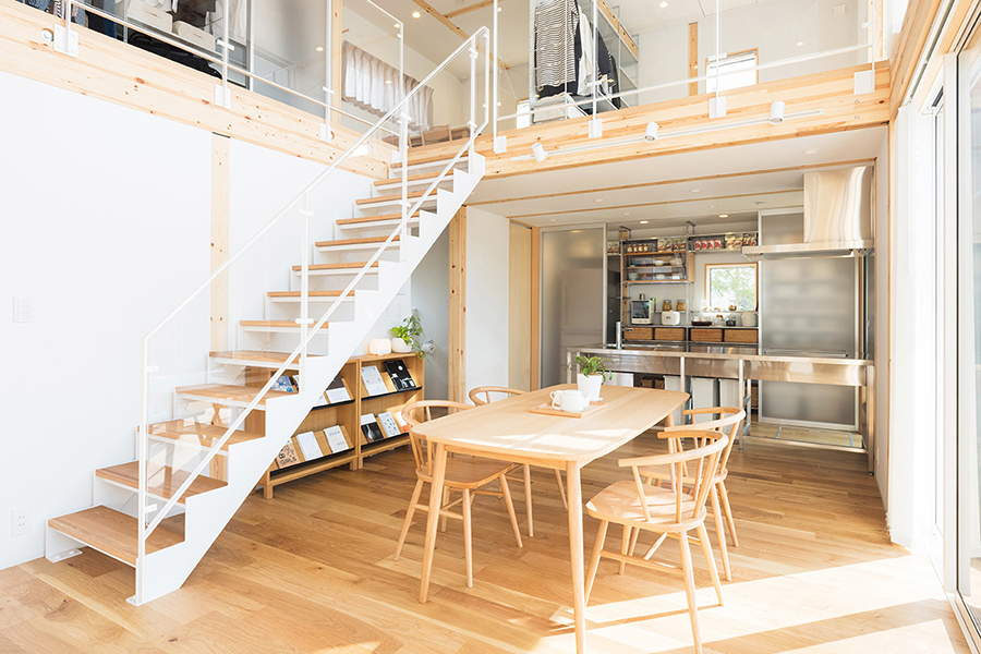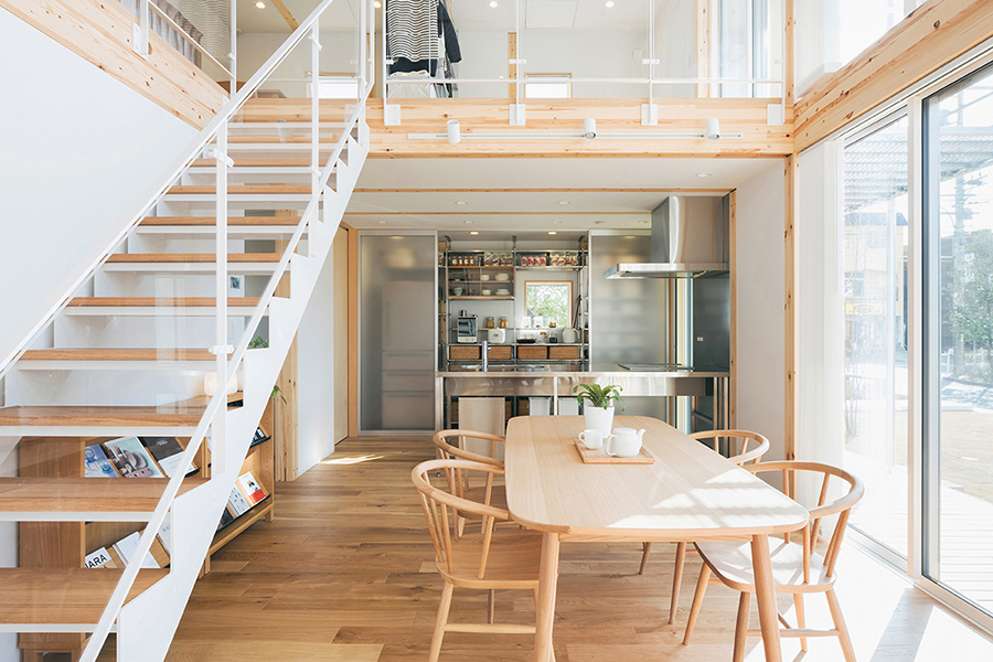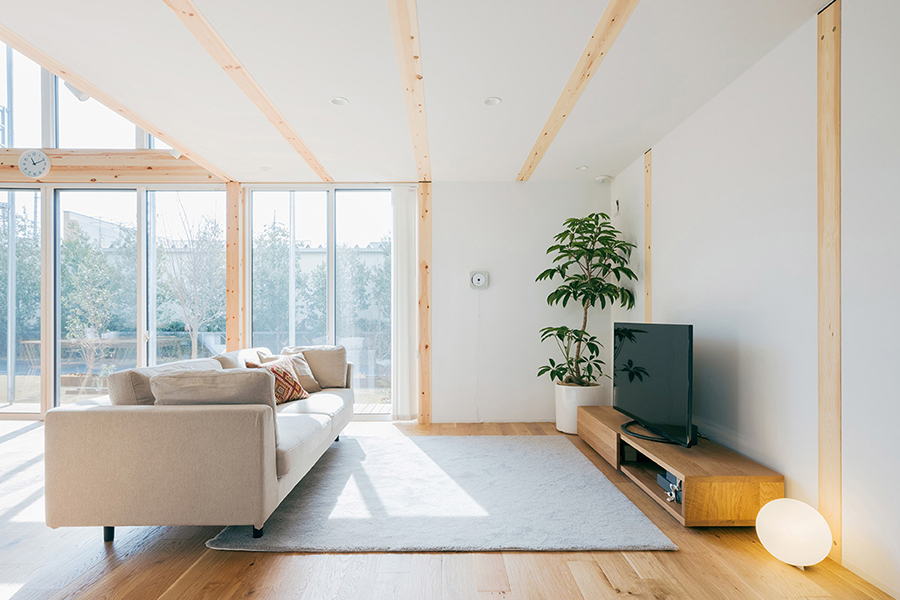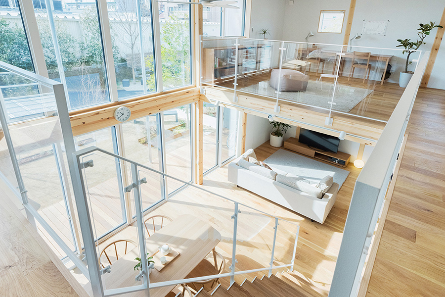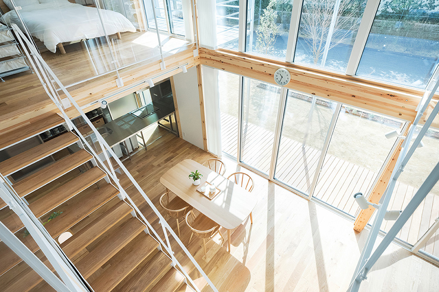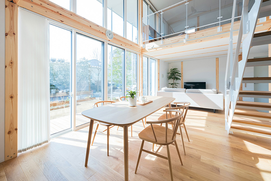 南側の吹き抜けに面した大きな開口部からたくさんの光を取り込み、家全体が明るく心地の良い空間です。内部は柱や梁があらわしとなっている真壁仕様、フローリングはハンドスクレイプオークを採用しており空間全体で木のぬくもりを感じられる仕上げとなっております。自然のエネルギーを上手く生かし、「永く使える、変えられる。」木の家をぜひ体験ください。