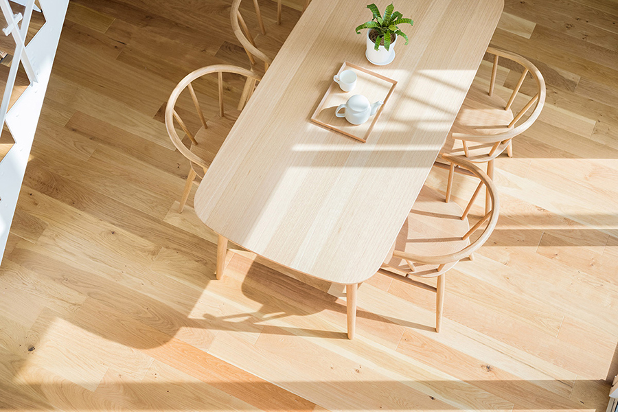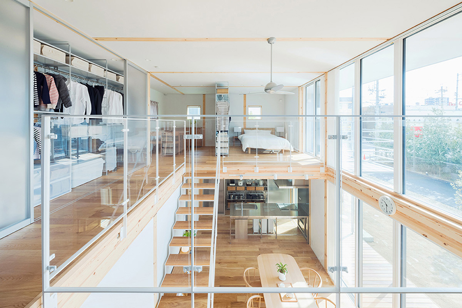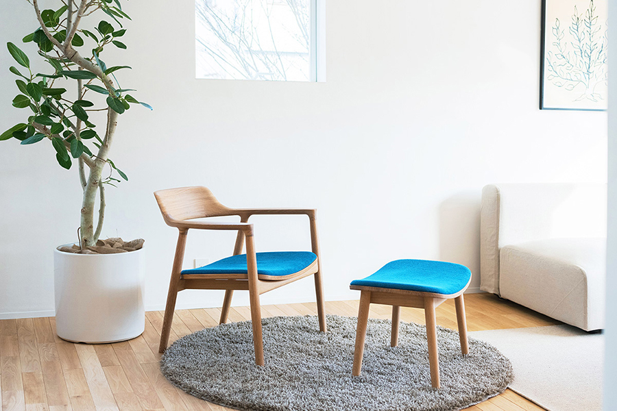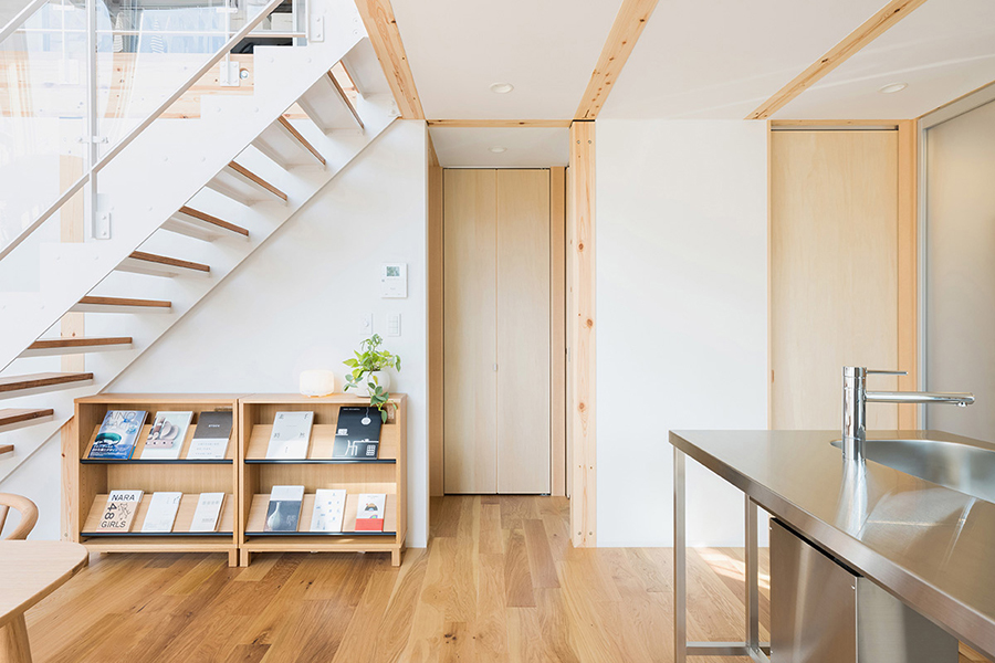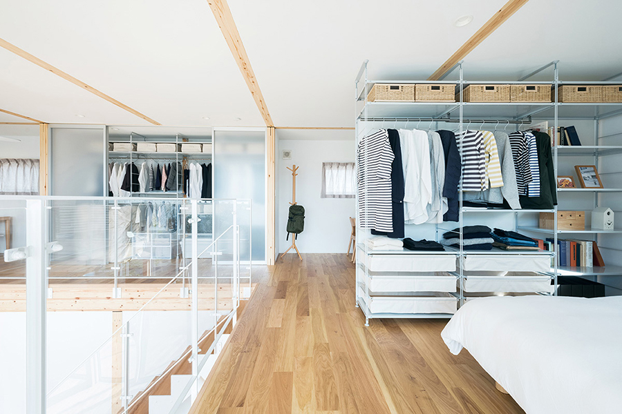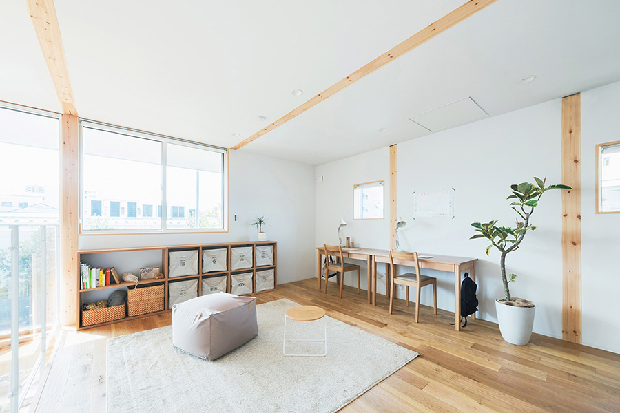 南側の吹き抜けに面した大きな開口部からたくさんの光を取り込み、家全体が明るく心地の良い空間です。内部は柱や梁があらわしとなっている真壁仕様、フローリングはハンドスクレイプオークを採用しており空間全体で木のぬくもりを感じられる仕上げとなっております。自然のエネルギーを上手く生かし、「永く使える、変えられる。」木の家をぜひ体験ください。