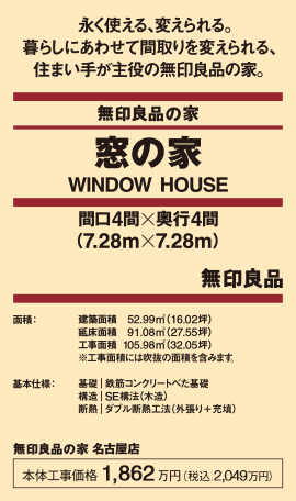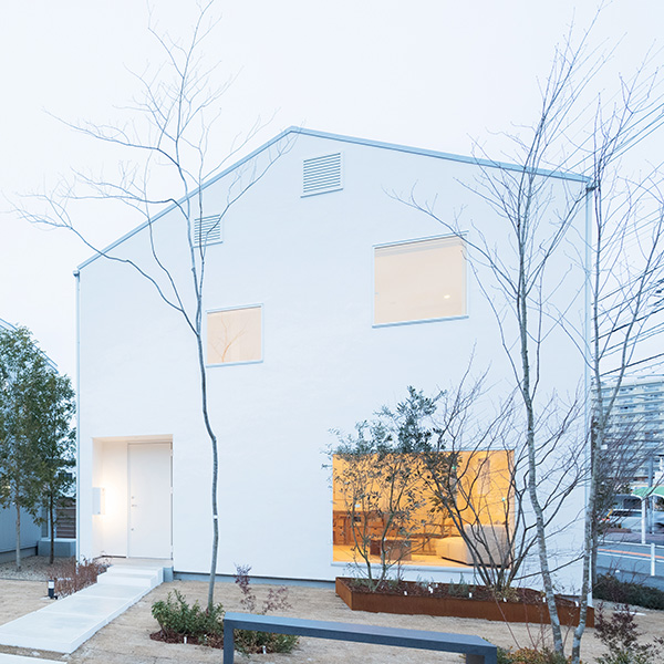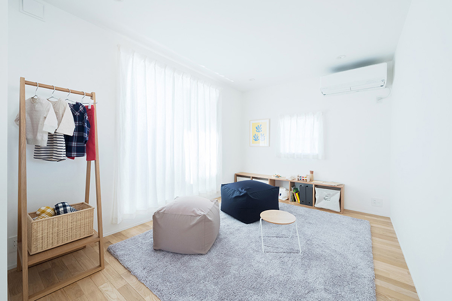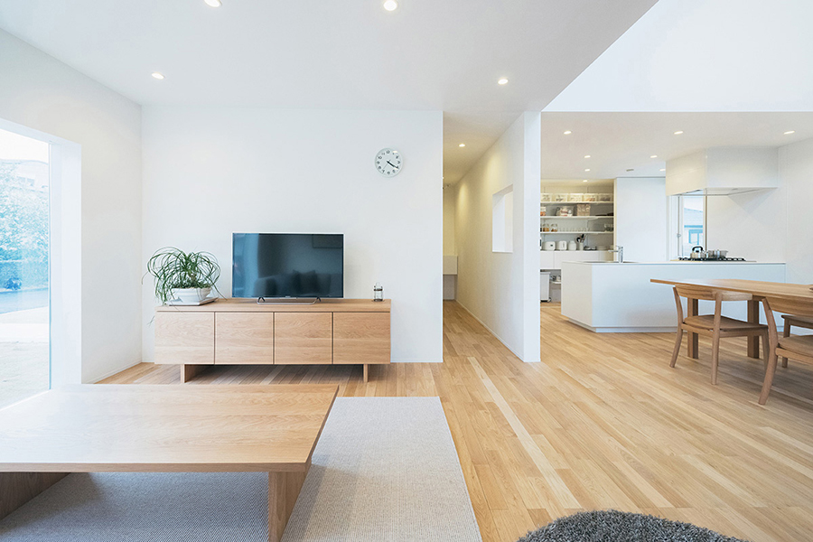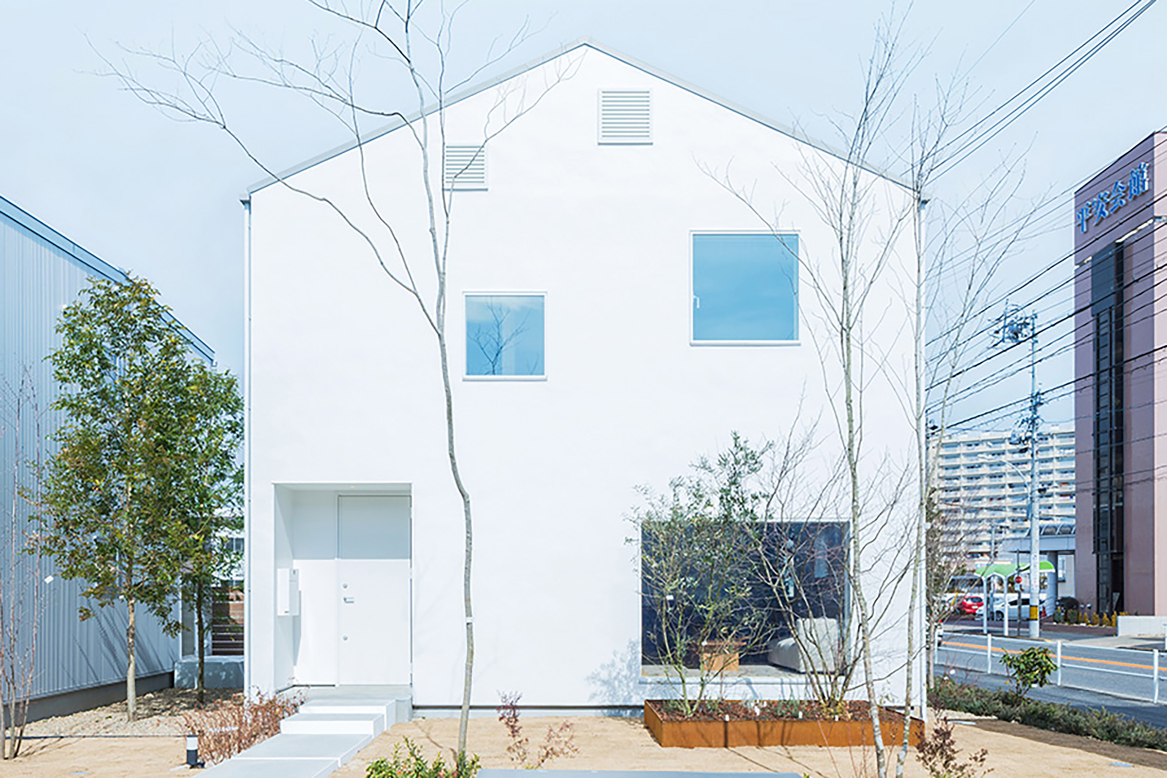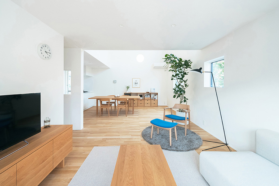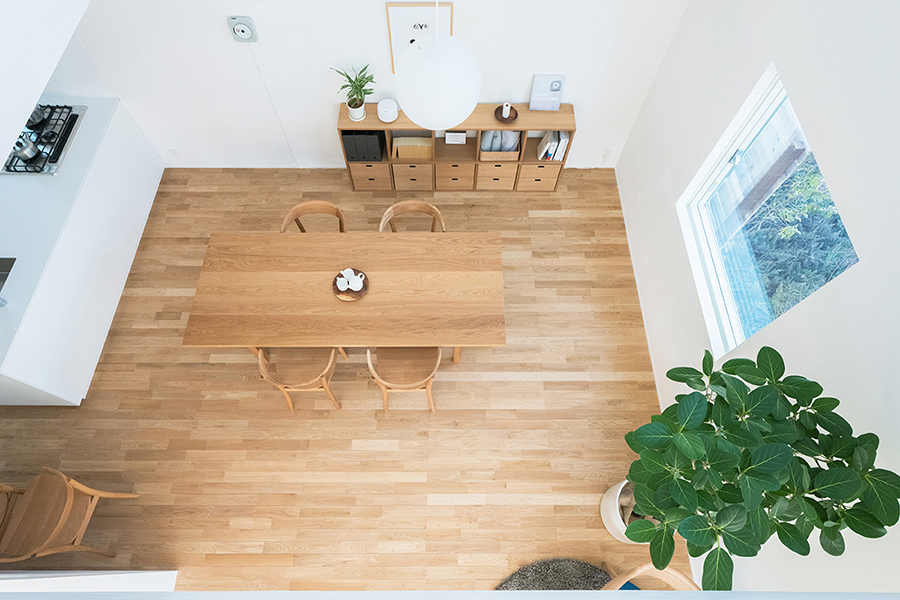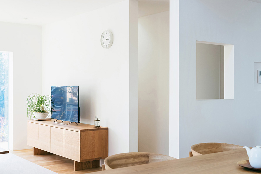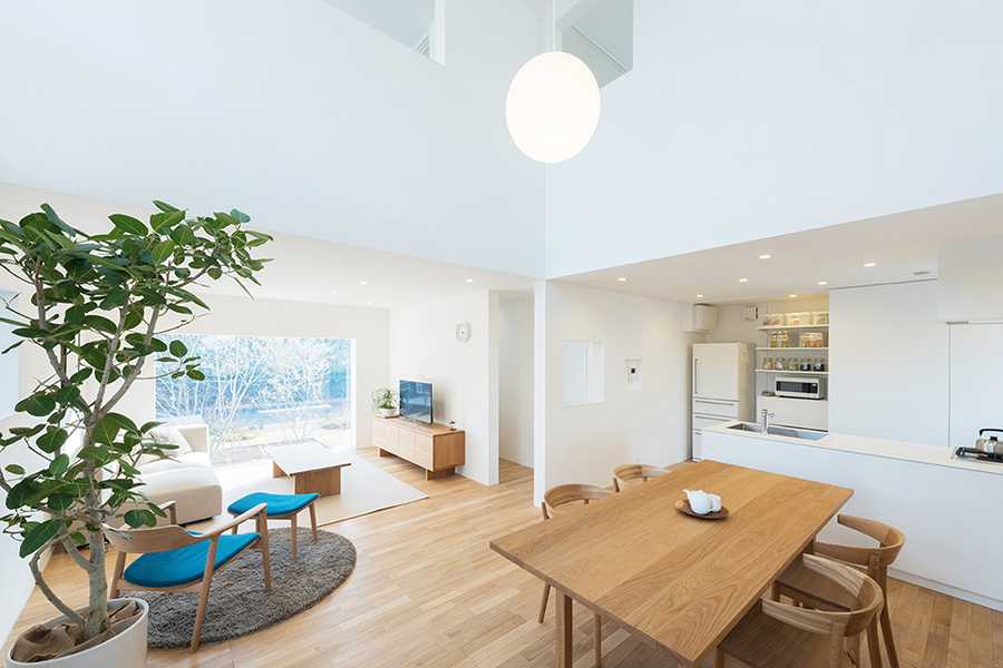 子供が描くような三角屋根に四角い窓。窓の家は、誰もが幼い頃に思い描いた家のかたちをしています。青空や緑が窓によって絵のように切り取られ、室内に美しい景色を取り込んでくれます。内装は珪藻土仕上げの白い壁とナラ無垢材を使用したフローリングを採用しており、空間全体が柔らかく心地の良い空間に仕上がっております。仕上げが美しい窓の家をぜひ体感ください。
