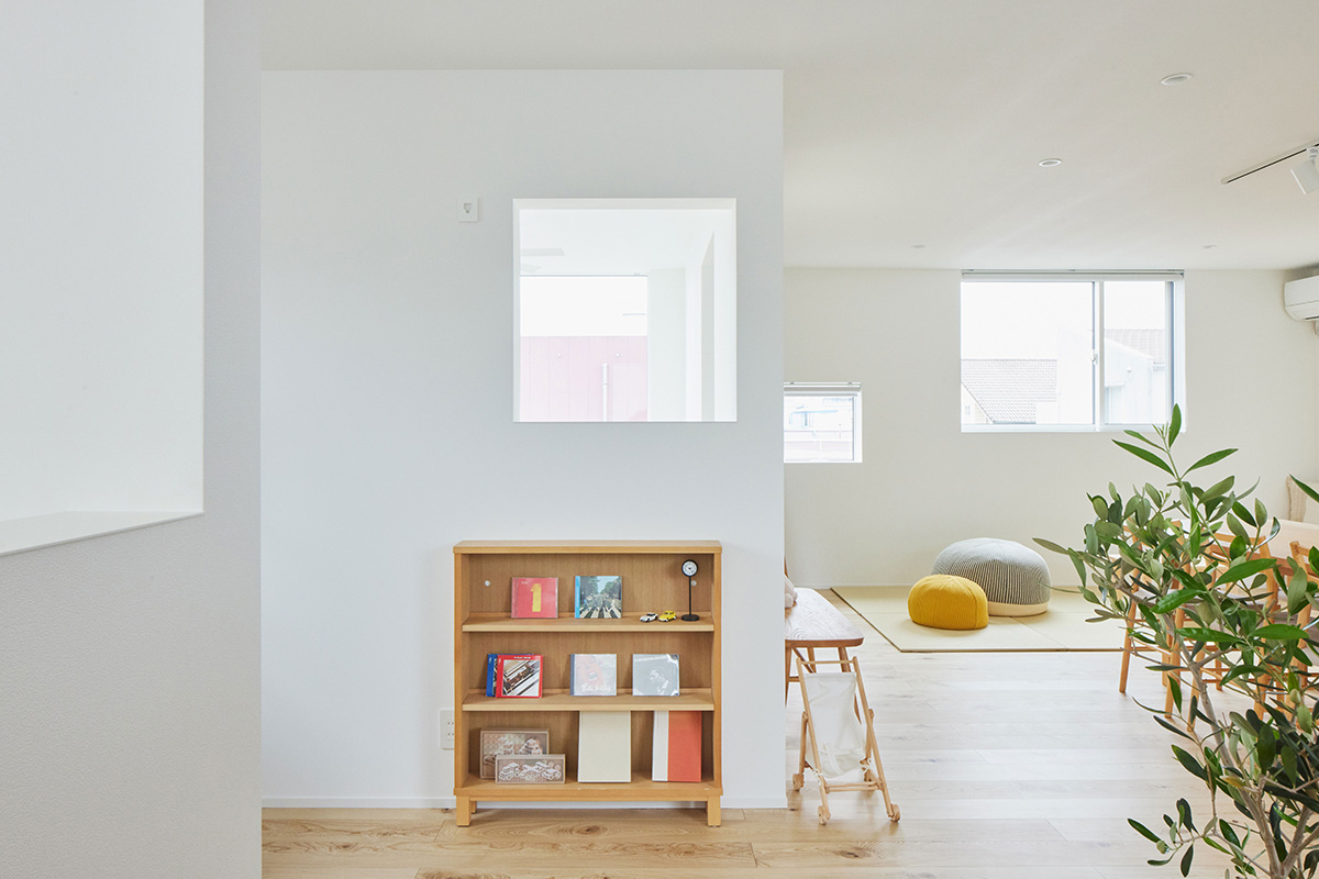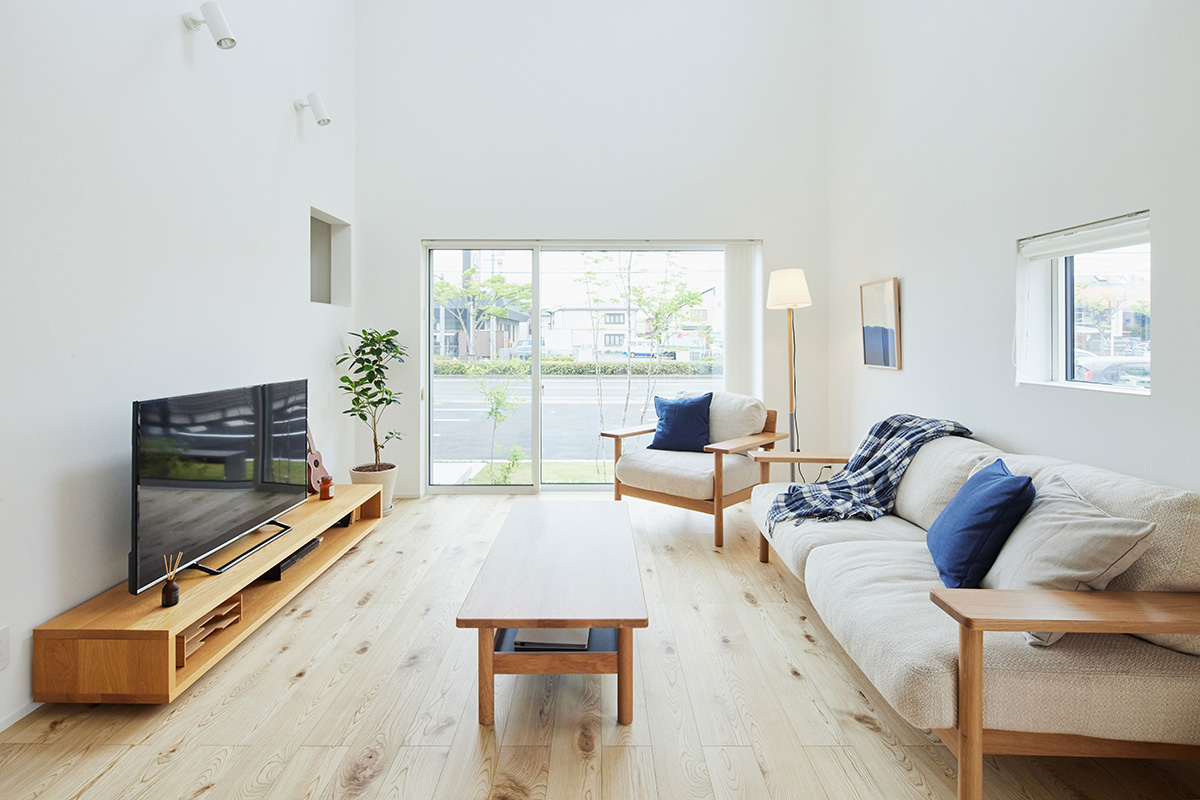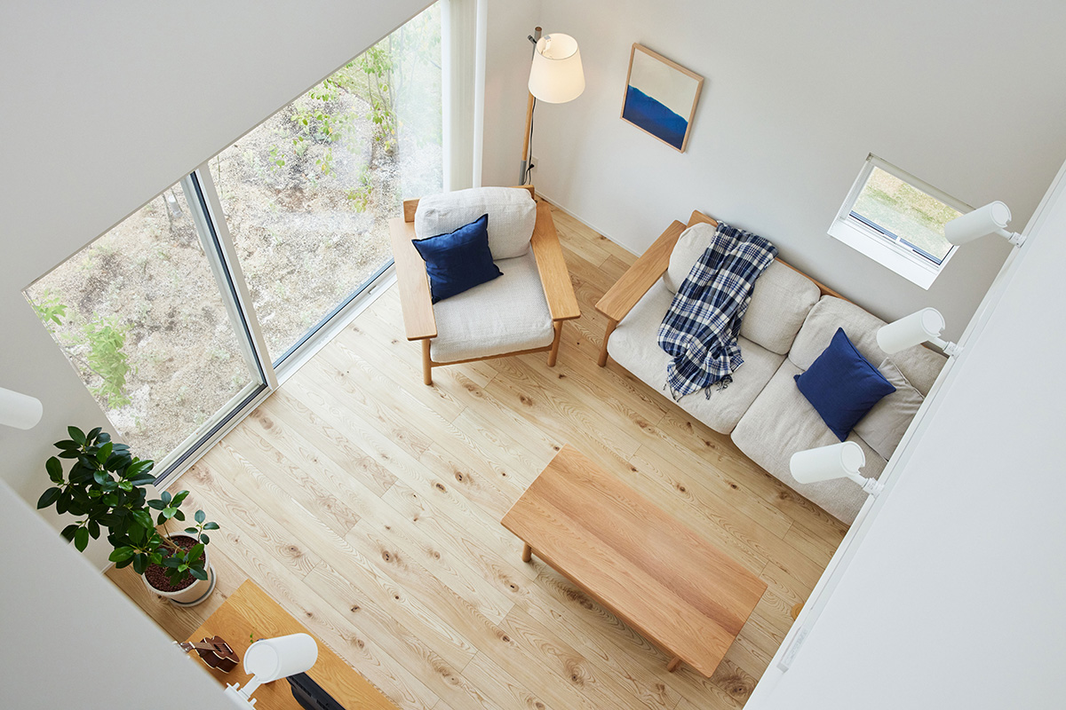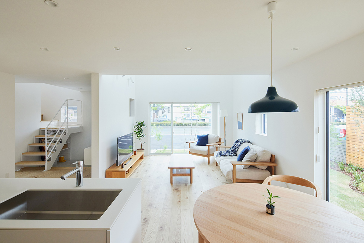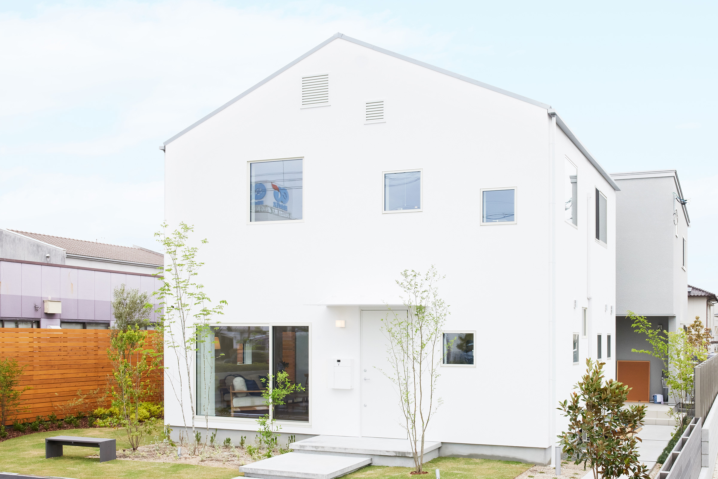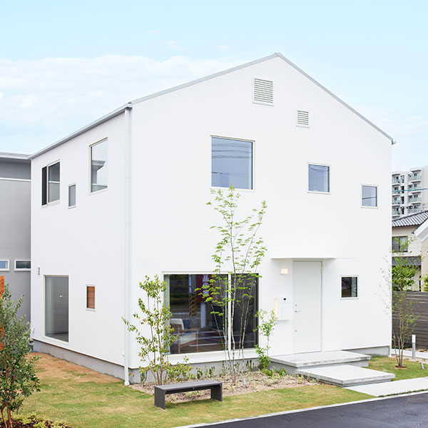 岡山南店は、真っ白な外壁に三角屋根が特長的な「窓の家」です。名前の通り、窓の在り方をさまざまな角度から考えて、配置しました。光と風を取り入れる窓、外の景色を切り取る窓、室内を緩やかにつなぐ室内窓。住まい手の考えに合わせて自在に窓を設け、外とつながる自由を大切にしました。