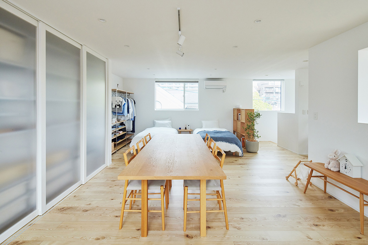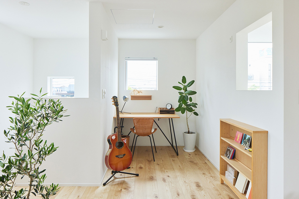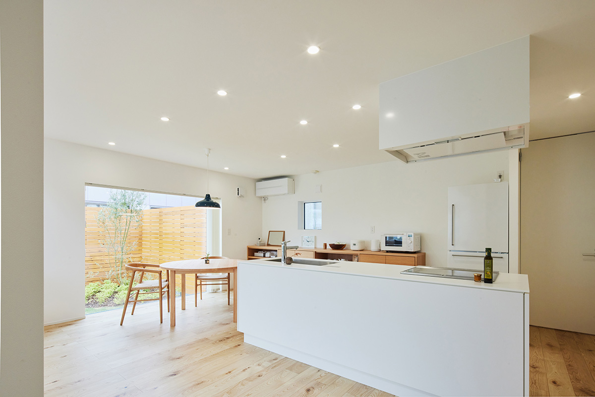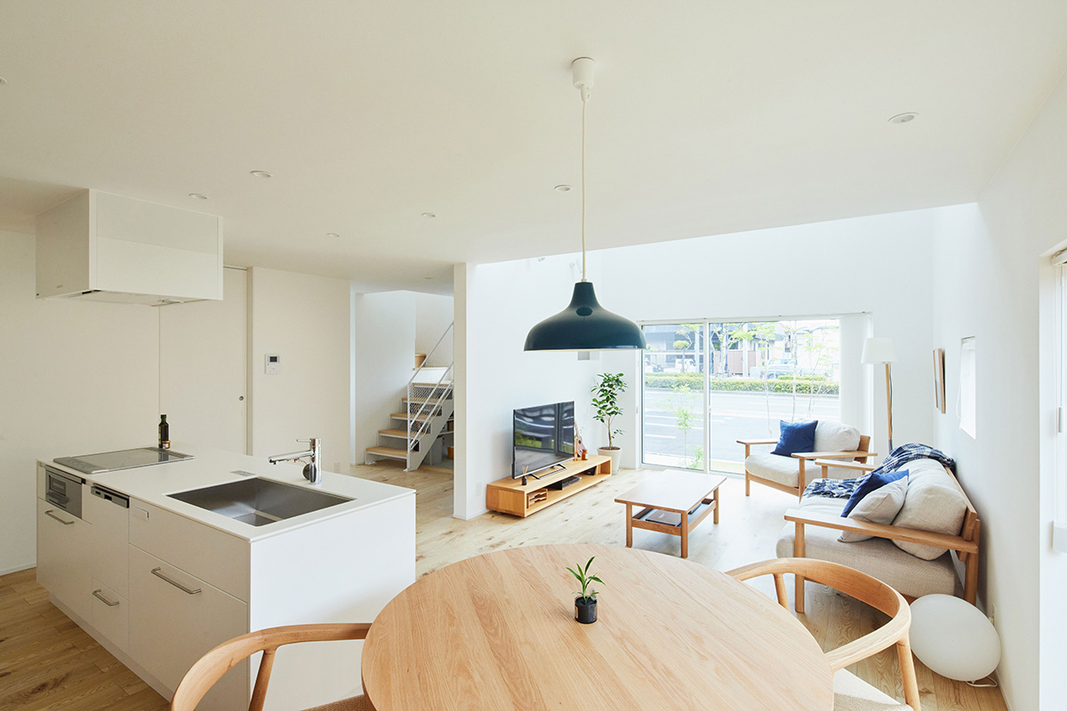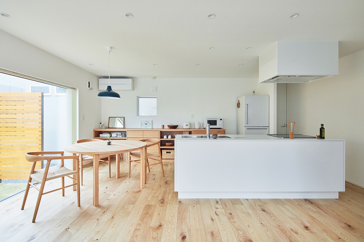 岡山南店は、真っ白な外壁に三角屋根が特長的な「窓の家」です。名前の通り、窓の在り方をさまざまな角度から考えて、配置しました。光と風を取り入れる窓、外の景色を切り取る窓、室内を緩やかにつなぐ室内窓。住まい手の考えに合わせて自在に窓を設け、外とつながる自由を大切にしました。