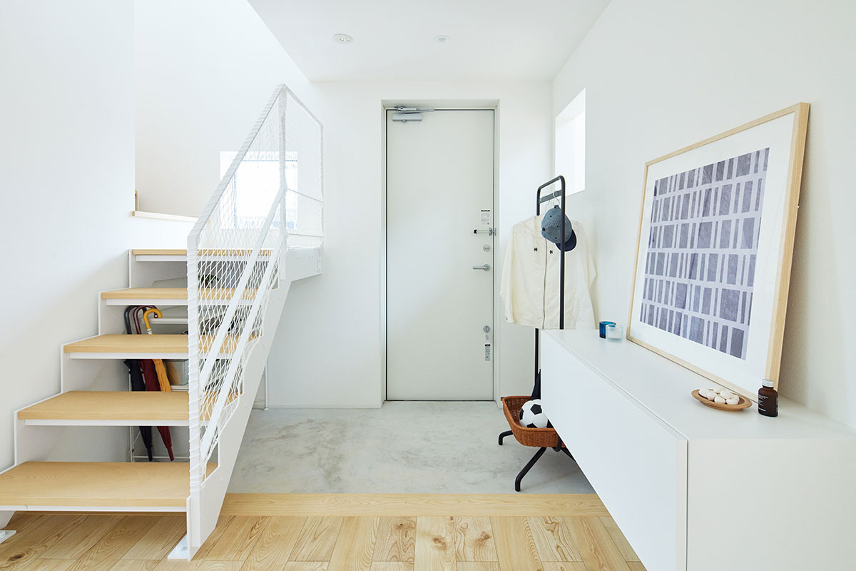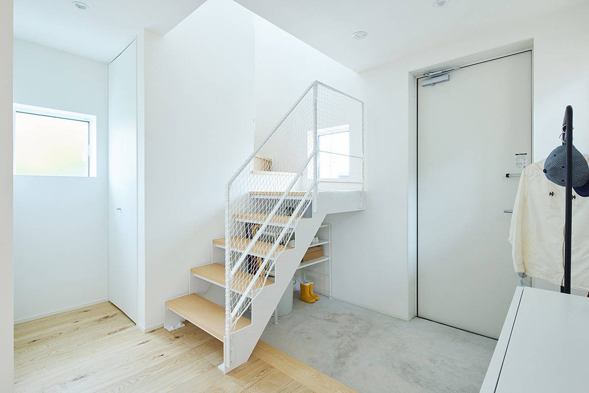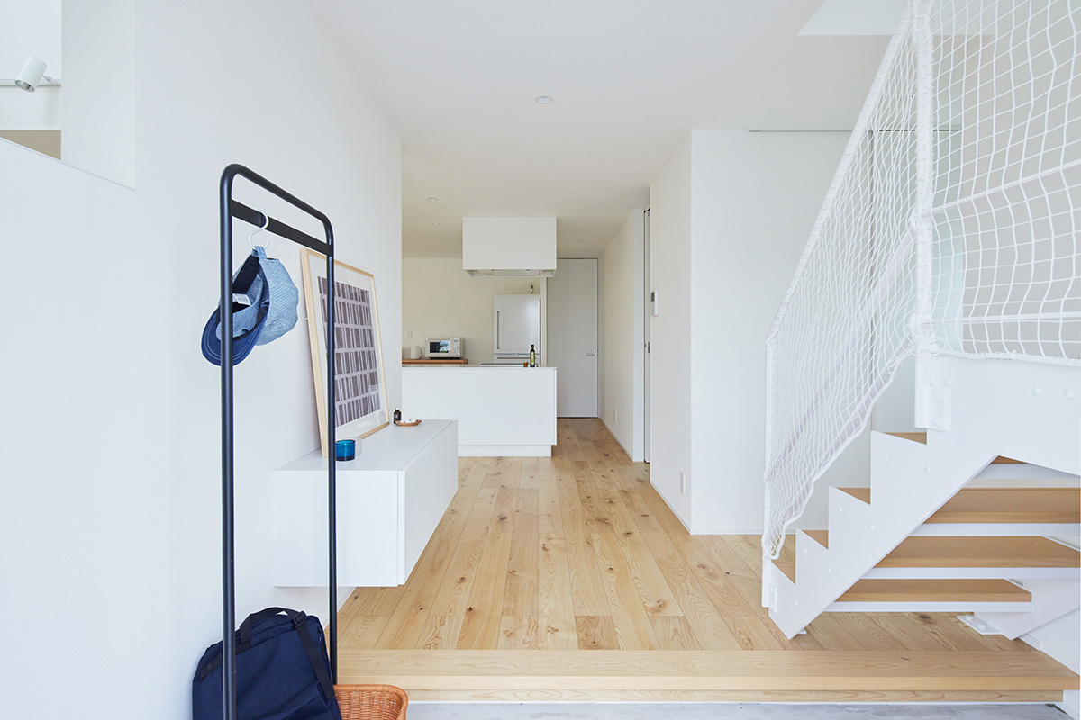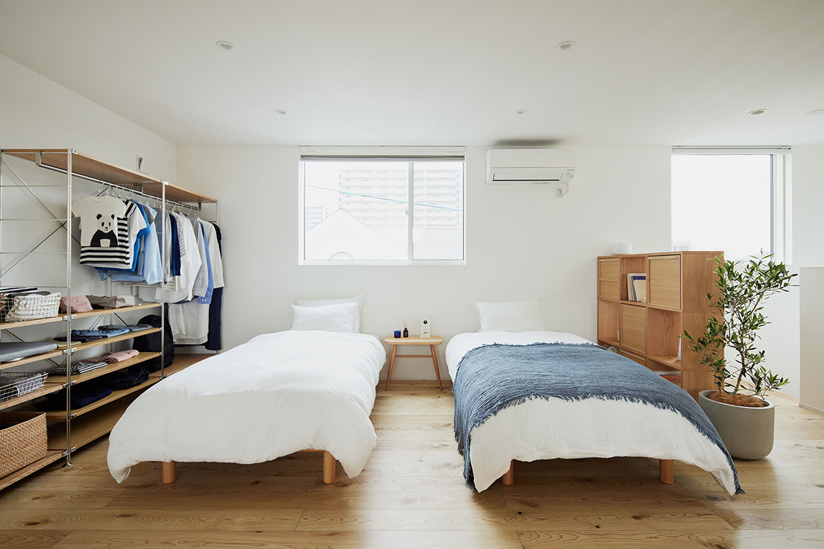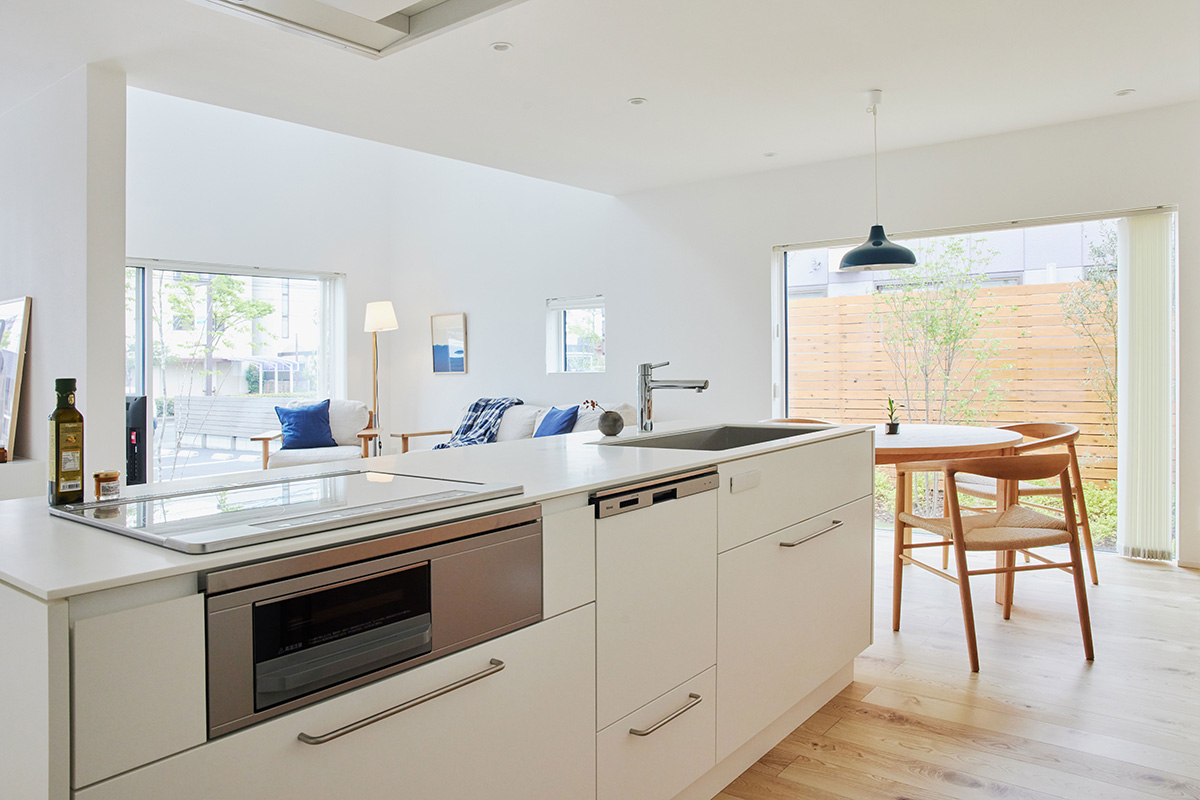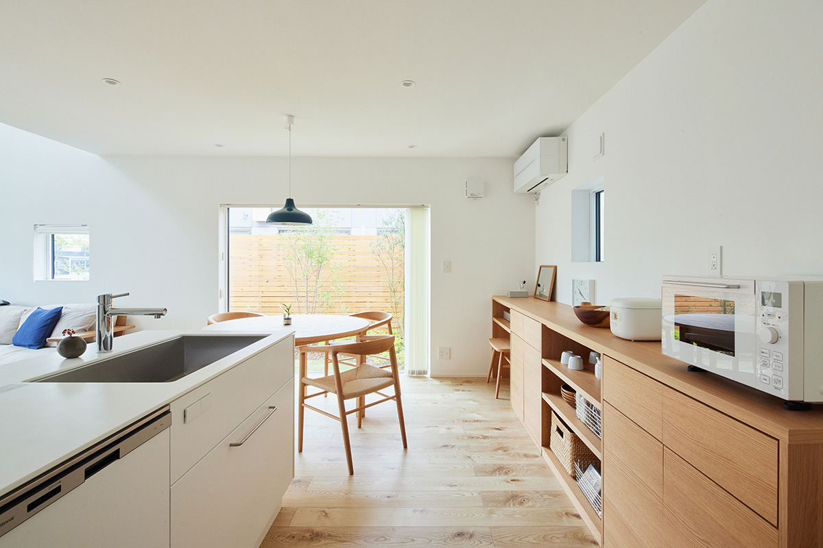 岡山南店は、真っ白な外壁に三角屋根が特長的な「窓の家」です。名前の通り、窓の在り方をさまざまな角度から考えて、配置しました。光と風を取り入れる窓、外の景色を切り取る窓、室内を緩やかにつなぐ室内窓。住まい手の考えに合わせて自在に窓を設け、外とつながる自由を大切にしました。