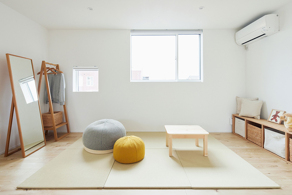 間取りはお子さまのいる4人家族の暮らしを想定した4間×4間の大きさとなっています。リビングの上に吹き抜けを設け、暖かな日差しが降り注ぐ、心地の良い空間となっております。室内も白を基調とし、インテリアは差し色(ブルー)を合わせています。晴れ渡った空や穏やかな瀬戸内海の「晴れの国 岡山」をイメージしています。細部にまでこだわったモデルハウスをぜひご体感ください。