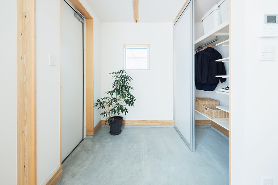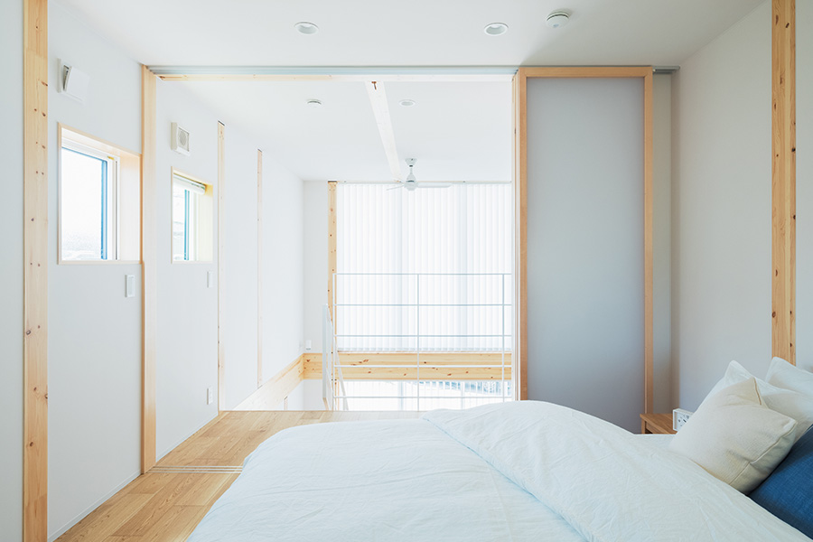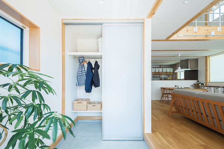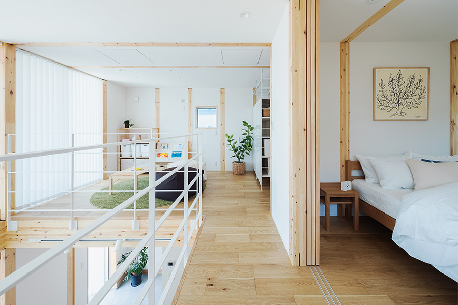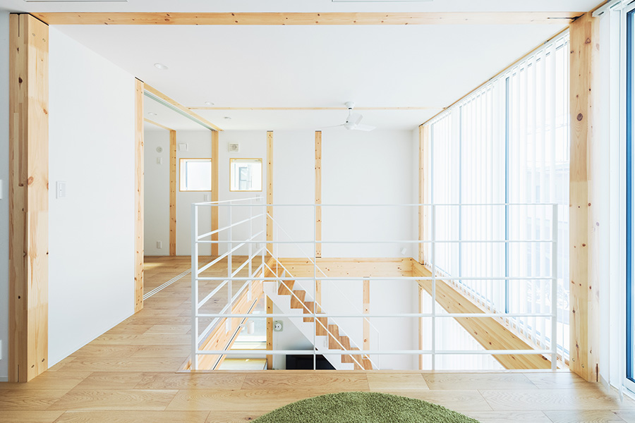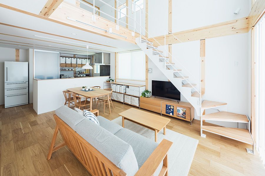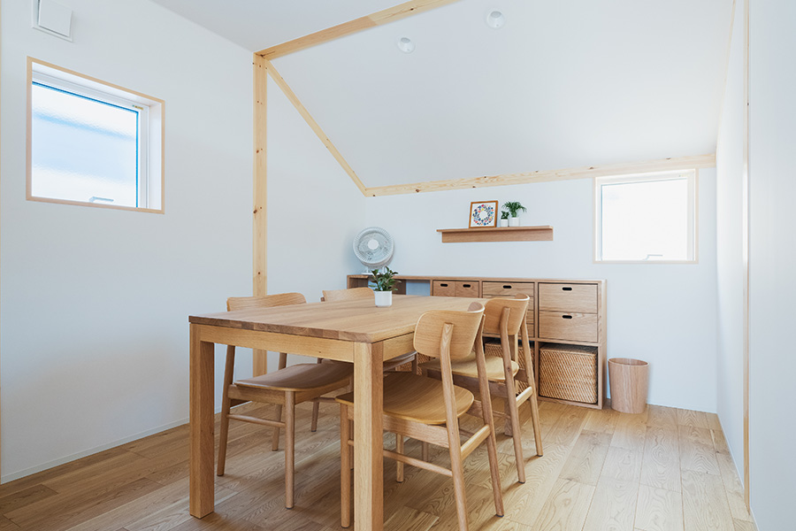 大きな開口と深い軒、南側へ大きく穿たれた吹抜けを配し、コンパクトながら視覚的にも伸びのある空間の「木の家」を一度ご覧ください。