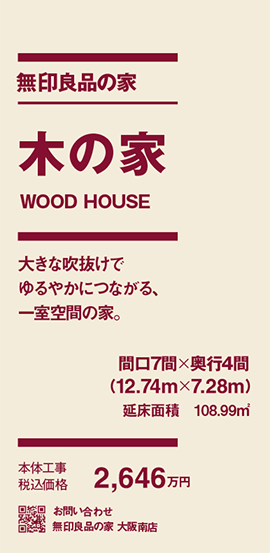 無印良品の家 大阪南店は「木の家」2階建てモデルハウス。明るい日差しが注ぐ2方向の開口、広い玄関土間とリビングの大きな吹抜けが特徴です。地震に強い構造、自然の光・風を取り入れる設計、将来的に間取りを変えられる「永く使える、変えられる」というコンセプトを体感できるモデルハウスで、皆さまのご来場をお待ちしております。