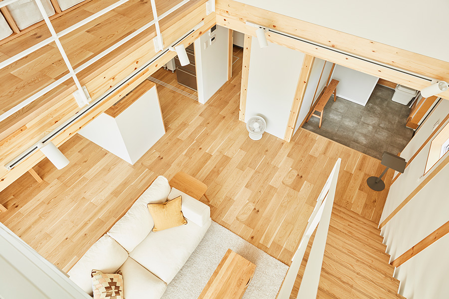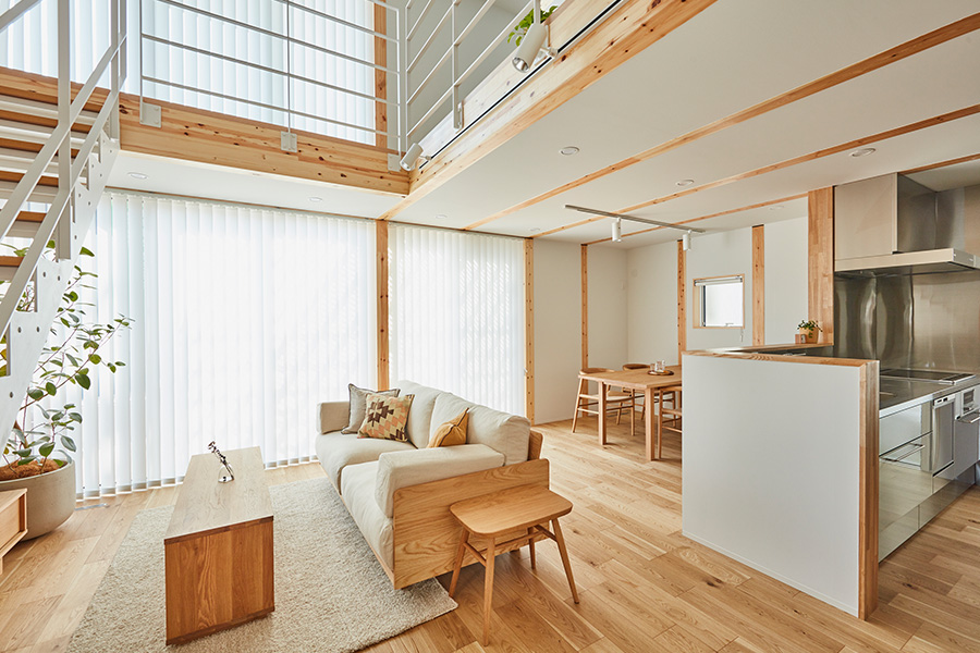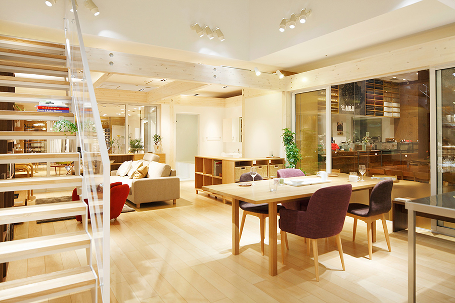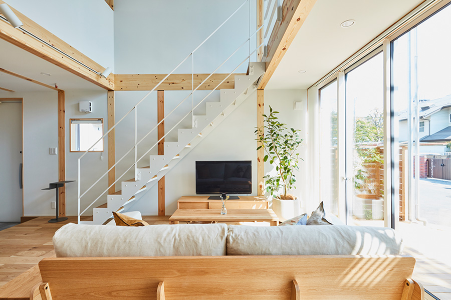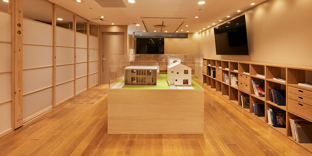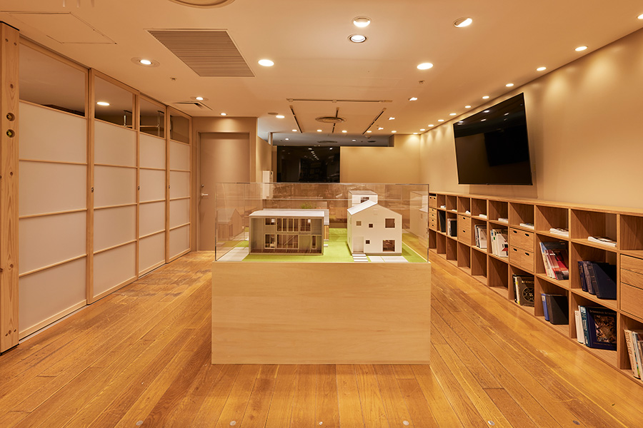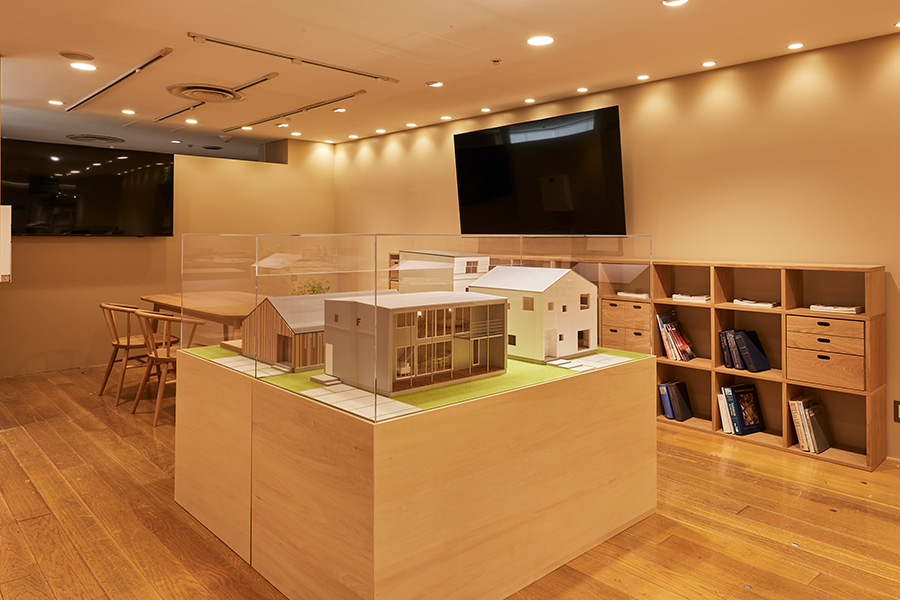 調布市でご覧いただけるモデル棟は「木の家」で、吹抜けを中心とした間仕切りがない一室空間とし、南側が周囲の環境に大きく開かれた箱型の住まい。大きな窓には伝統的な日本家屋の庇(ひさし)の仕組みが取り入れられ、四季を通して快適な室内環境が実現できる知恵も生かされています。