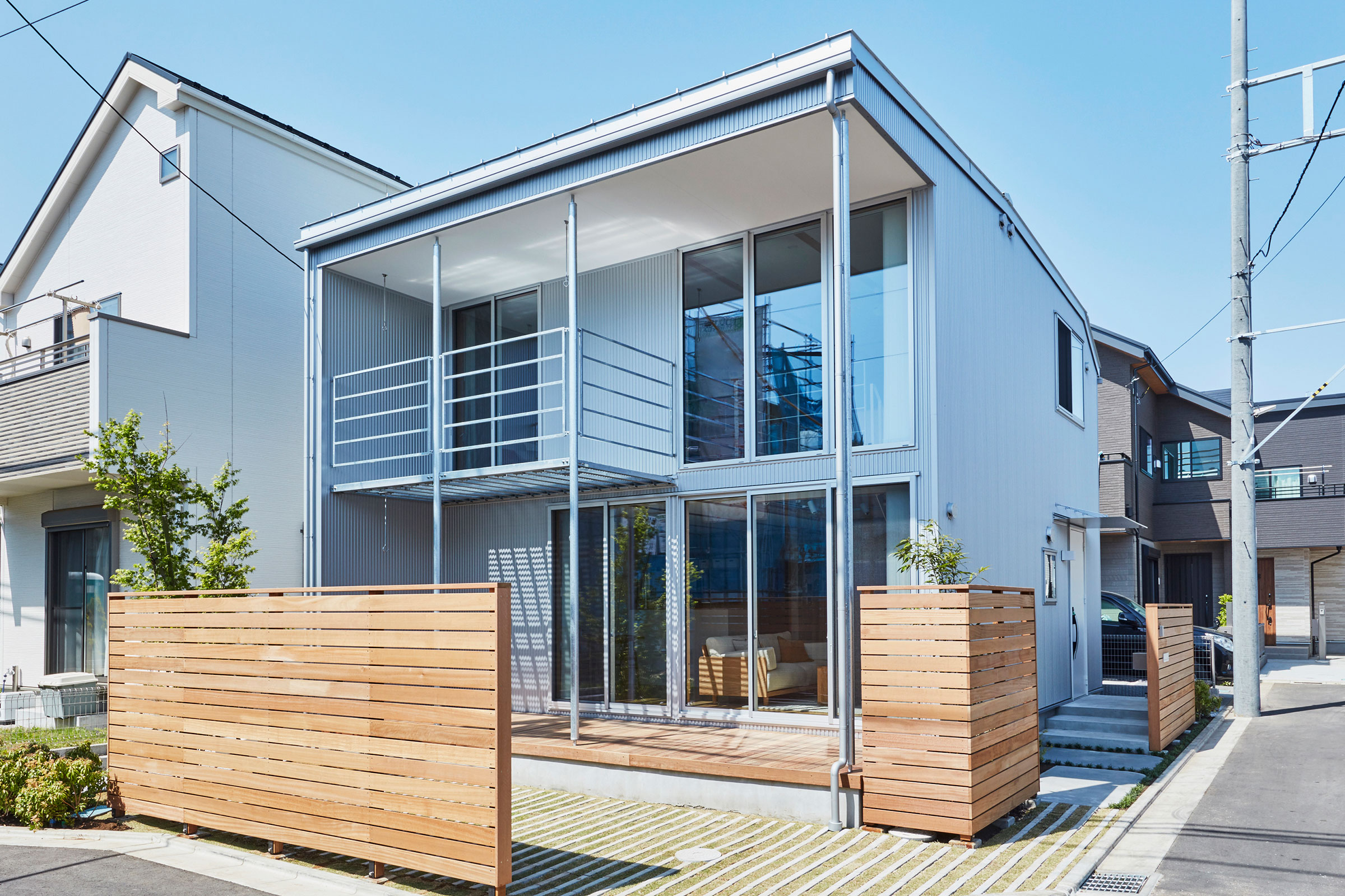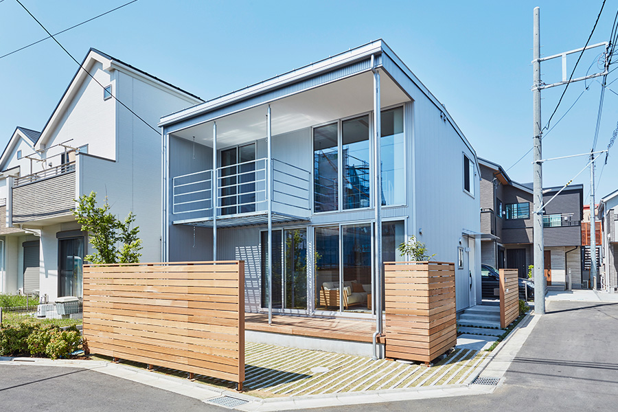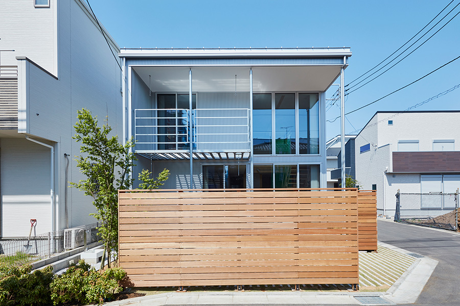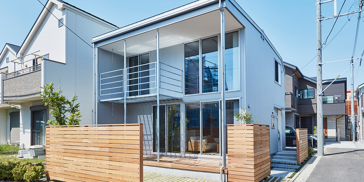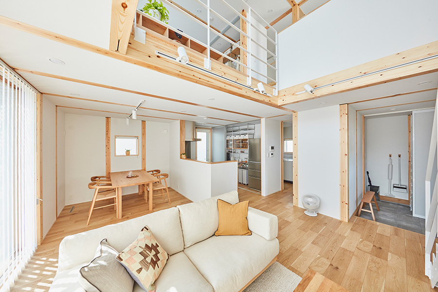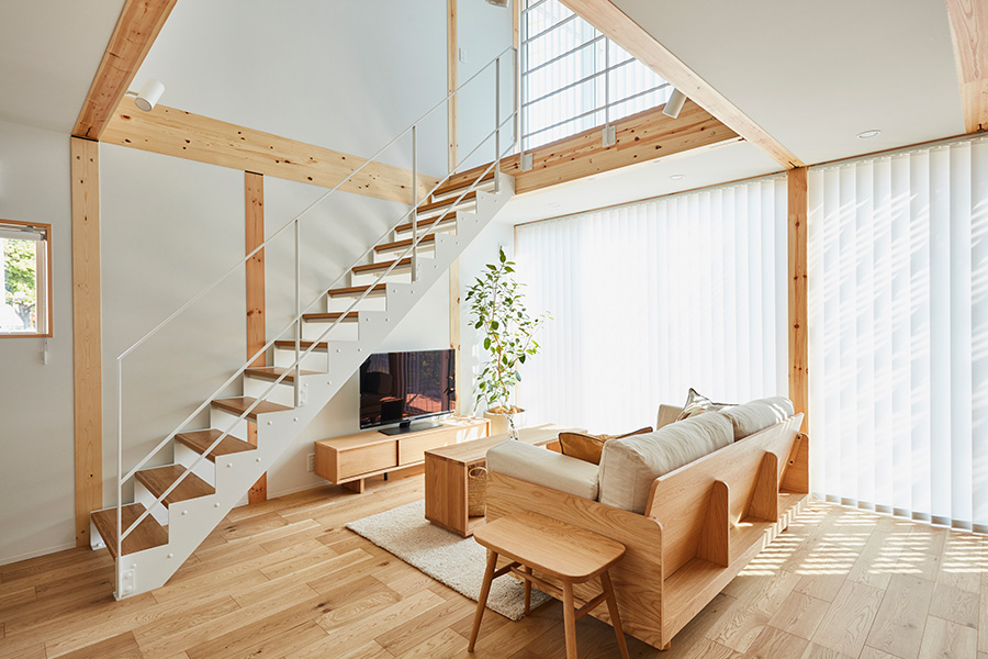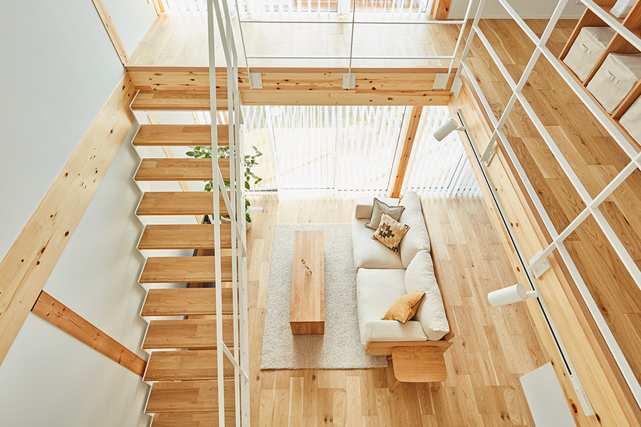 調布市でご覧いただけるモデル棟は「木の家」で、吹抜けを中心とした間仕切りがない一室空間とし、南側が周囲の環境に大きく開かれた箱型の住まい。大きな窓には伝統的な日本家屋の庇(ひさし)の仕組みが取り入れられ、四季を通して快適な室内環境が実現できる知恵も生かされています。
