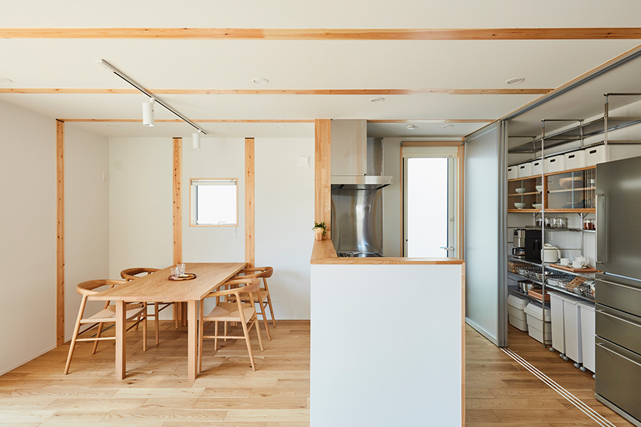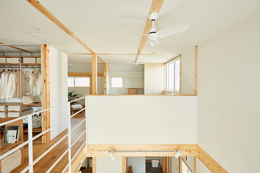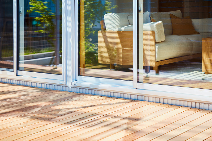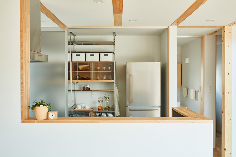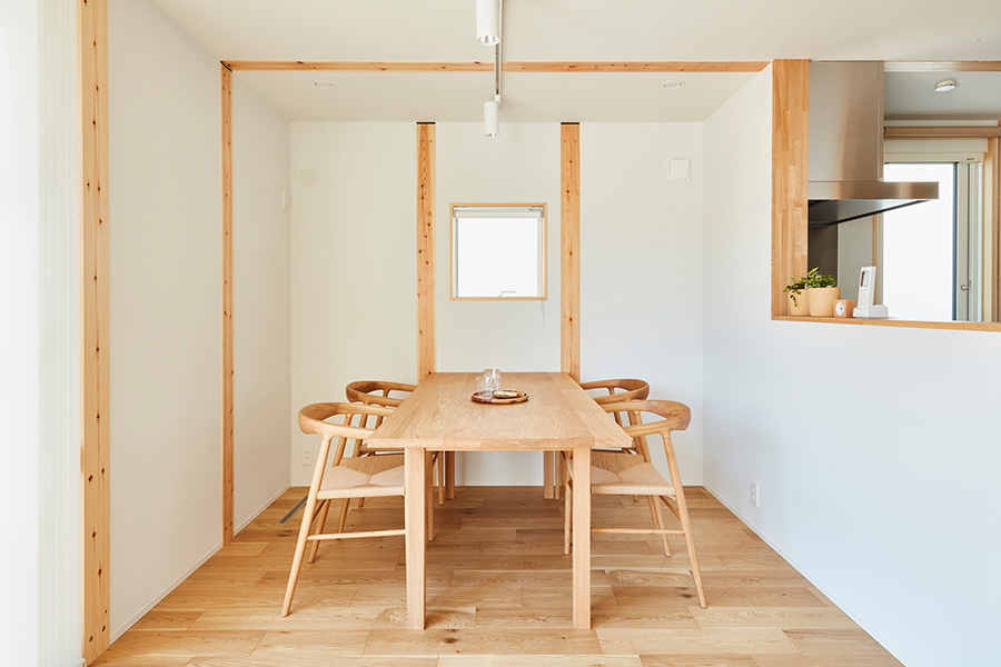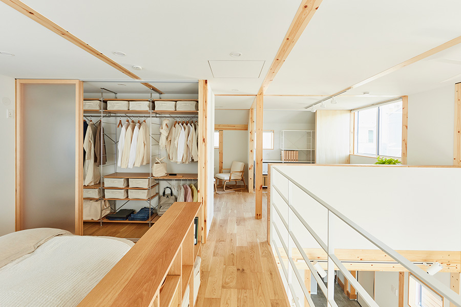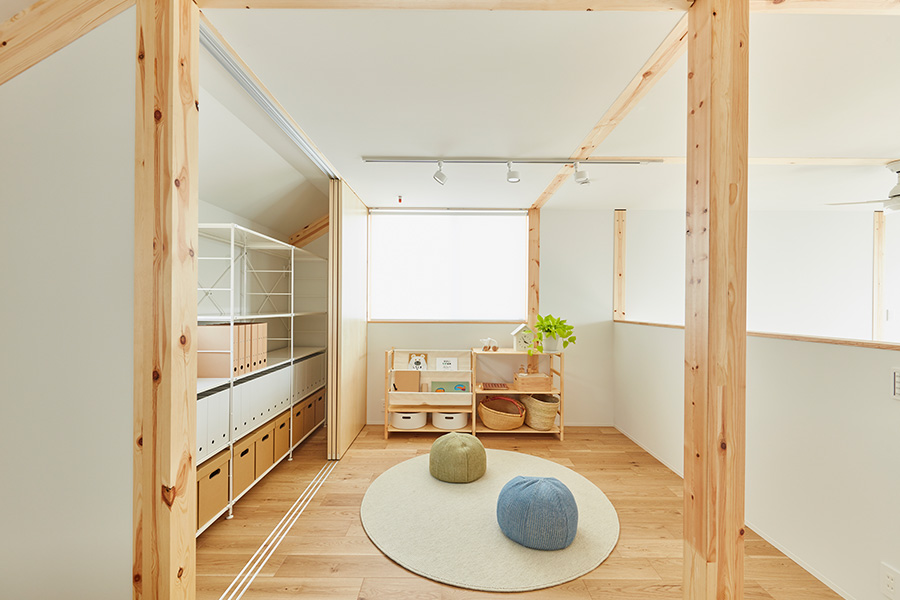 調布市でご覧いただけるモデル棟は「木の家」で、吹抜けを中心とした間仕切りがない一室空間とし、南側が周囲の環境に大きく開かれた箱型の住まい。大きな窓には伝統的な日本家屋の庇(ひさし)の仕組みが取り入れられ、四季を通して快適な室内環境が実現できる知恵も生かされています。