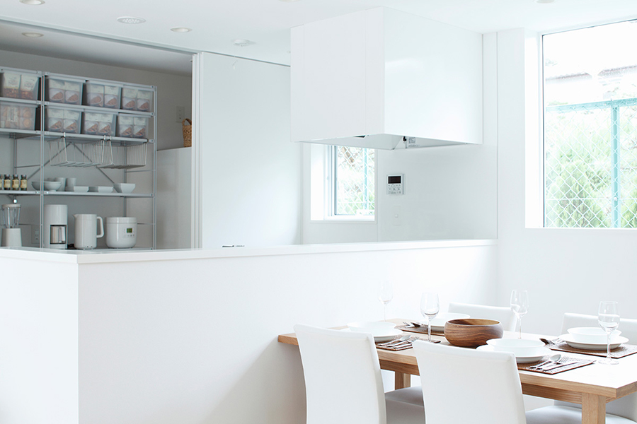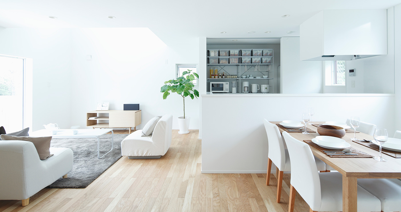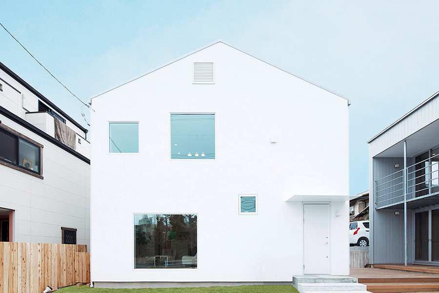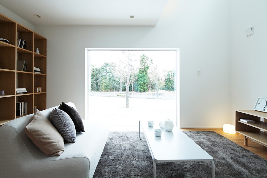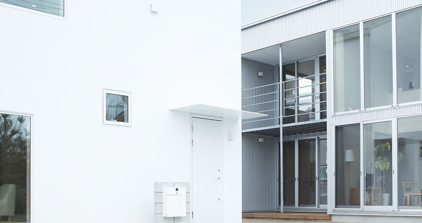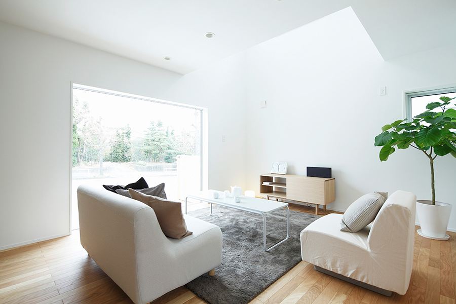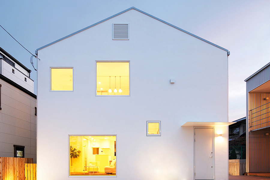 リビングから外の景色をとりこむ大きな窓、夕日がきれいな西側のインナーバルコニー、家族のつながりが感じられる吹抜け…。ほしい所に、必要なだけ、素直に窓を設けたら、美しい窓の家ができました。しっくい調の外壁とクロス仕上げの内壁、床材は標準のナラ材を採用しました。窓の家の特長である白い外壁の防汚性能を高めるため、旧仕様の外壁の上から再塗装をし、室内はインテリアを大幅にリニューアルしております。